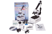 У этой модели очень простое устройство, его трудно сломать или повредить. При этом оптические элементы, как и у «взрослых» моделей, изготовлены из стекла. Набор для экспериментов и изготовления микропрепаратов в комплекте.