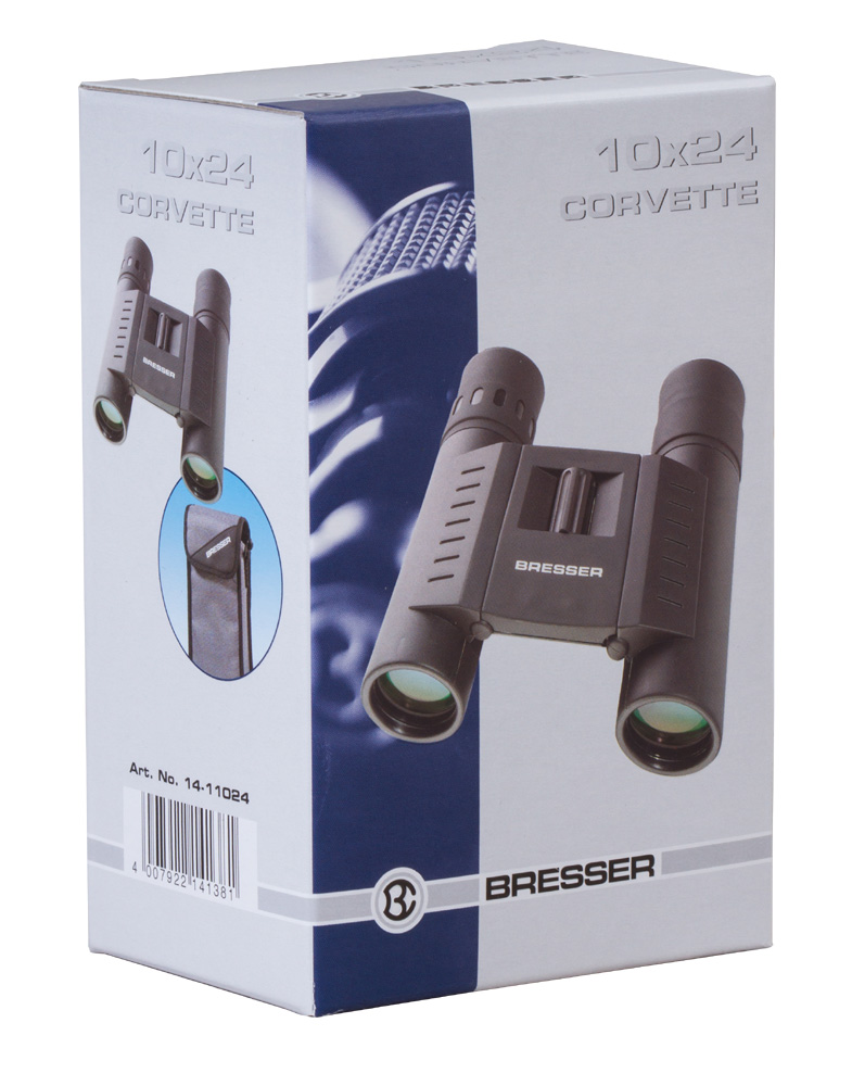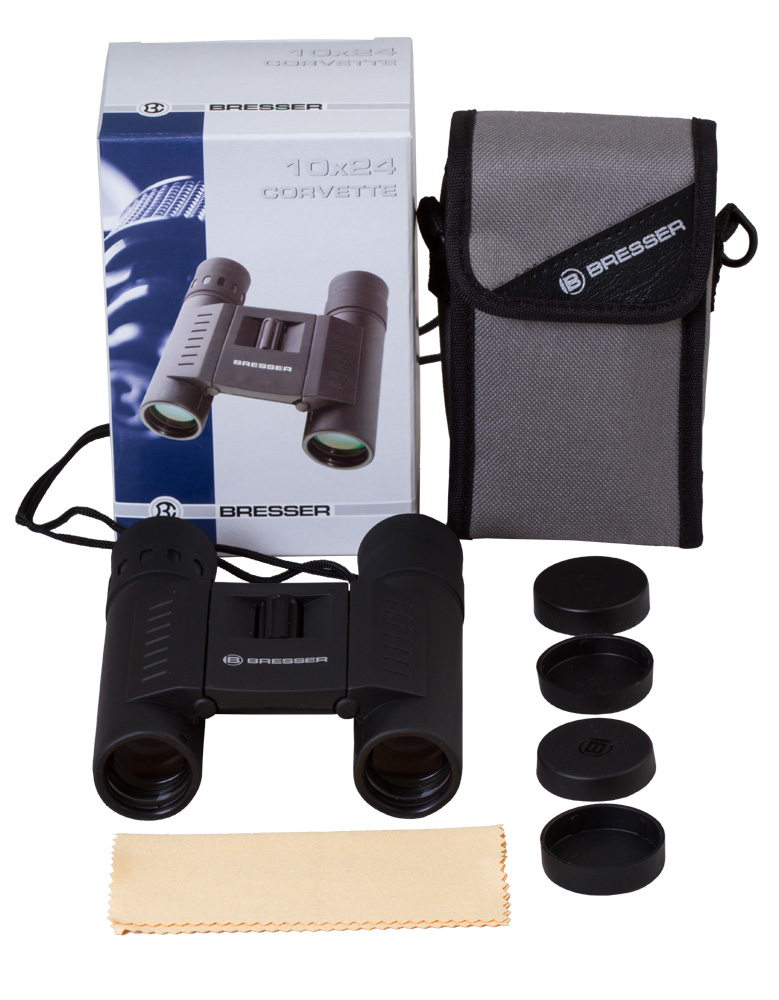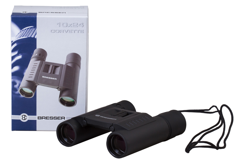 Bresser Corvette 10x24 LE m. T. представляет собой бинокль с высокими оптическими характеристиками и небольшими размерами. Призменная система типа roof («с крышей»), высококачественное стекло BaK-4, многослойное просветление оптики, – все это позволяет получить четкое изображение хорошего качества при сохранении компактных размеров и малого веса.