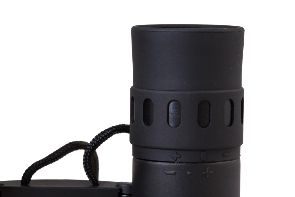 Эта модель рекомендована для использования в дневное время при хорошей освещенности, причем наблюдать можно не только на воздухе, но и в помещении – благодаря очень маленькой дистанции ближнего фокуса. Корпус бинокля пластиковый, в центральной его части расположен рельефный барабан системы фокусировки.