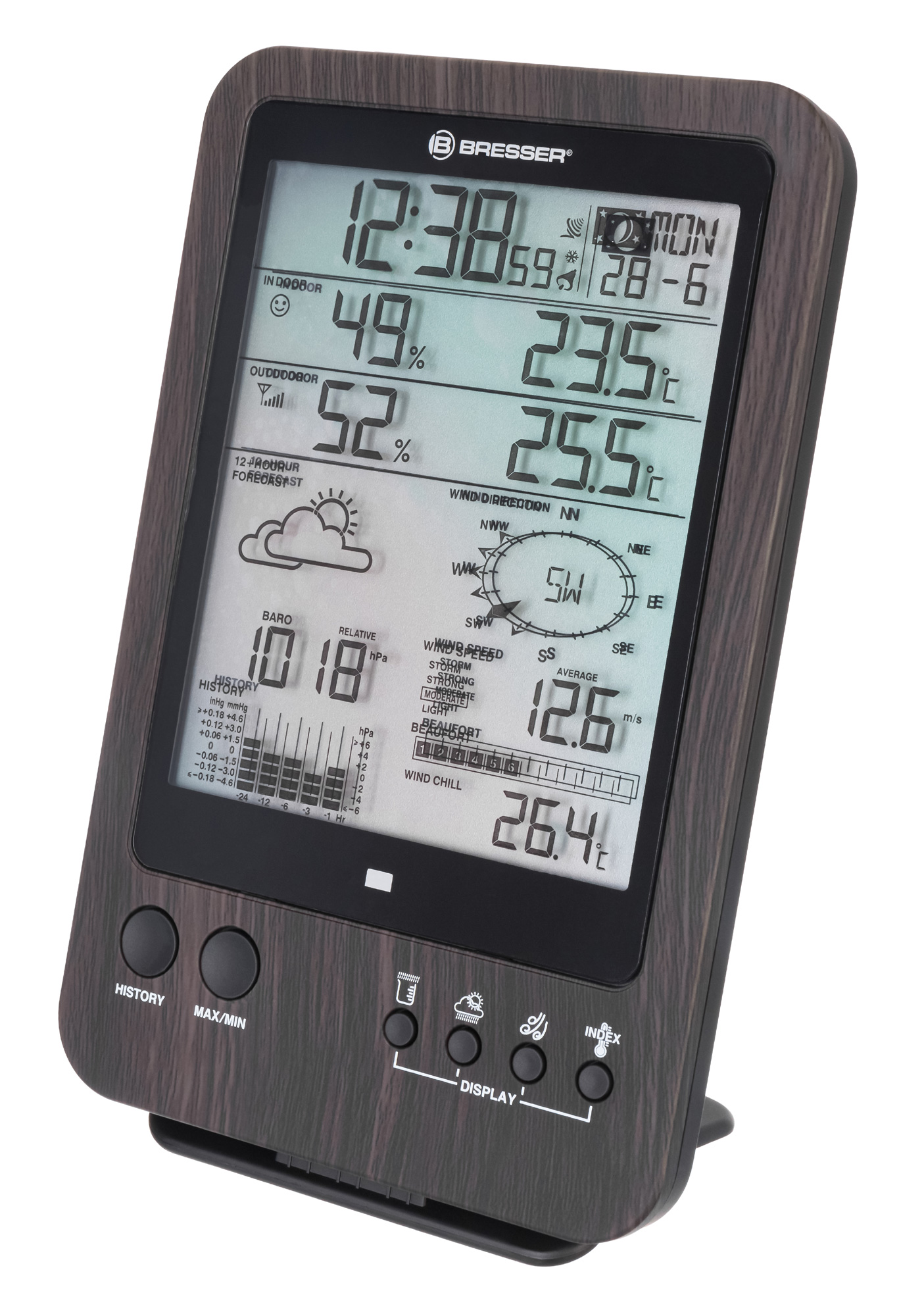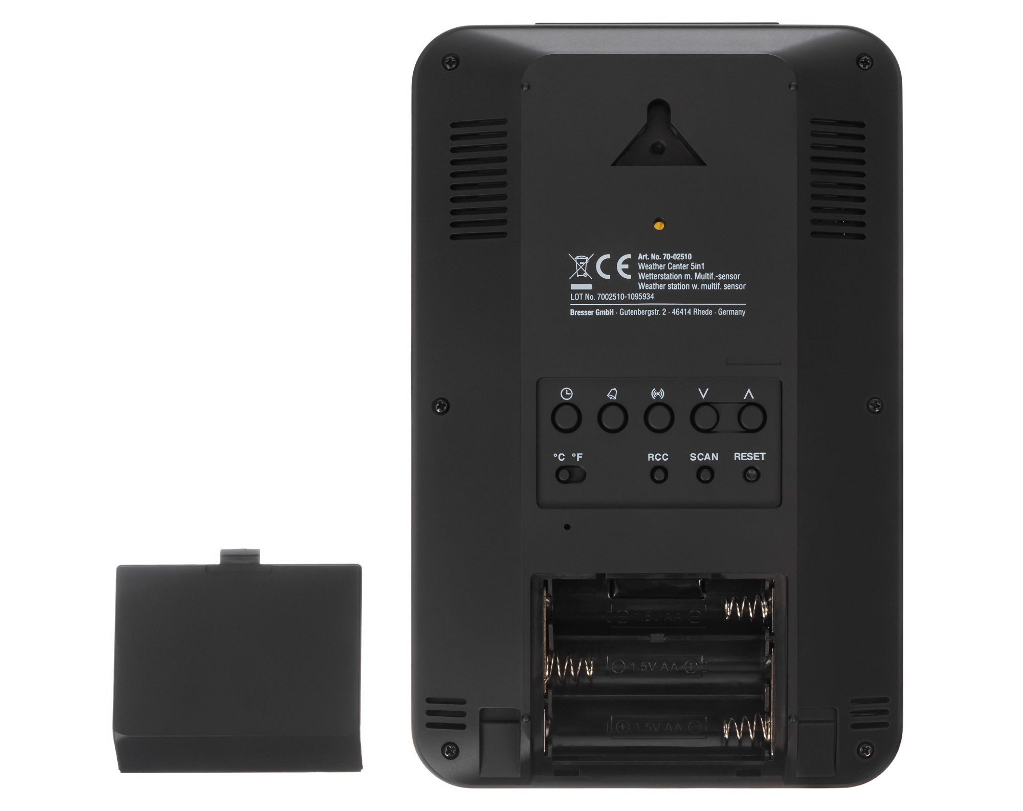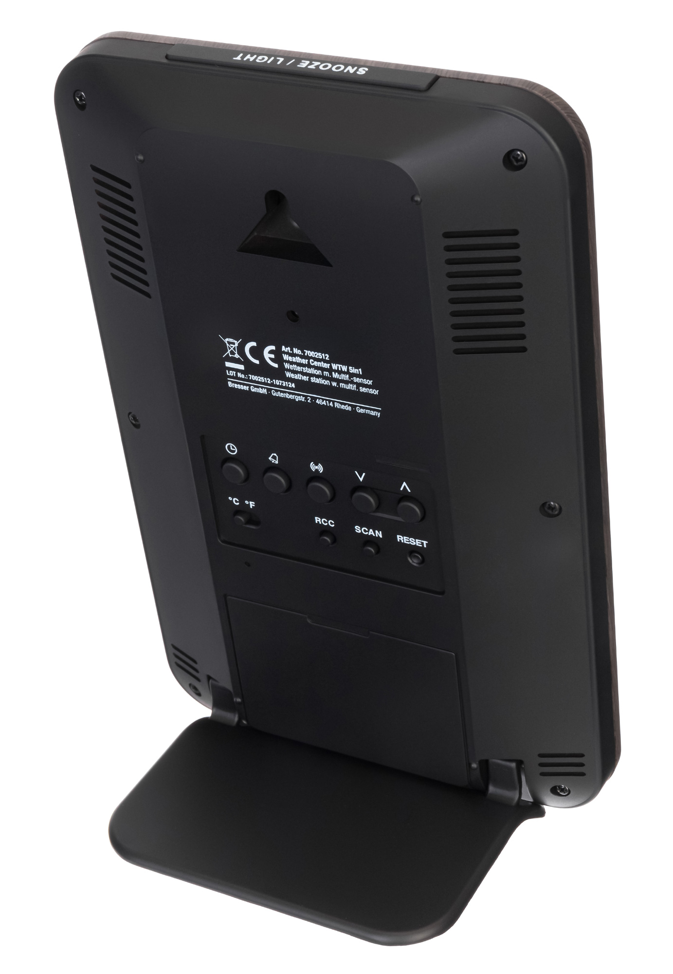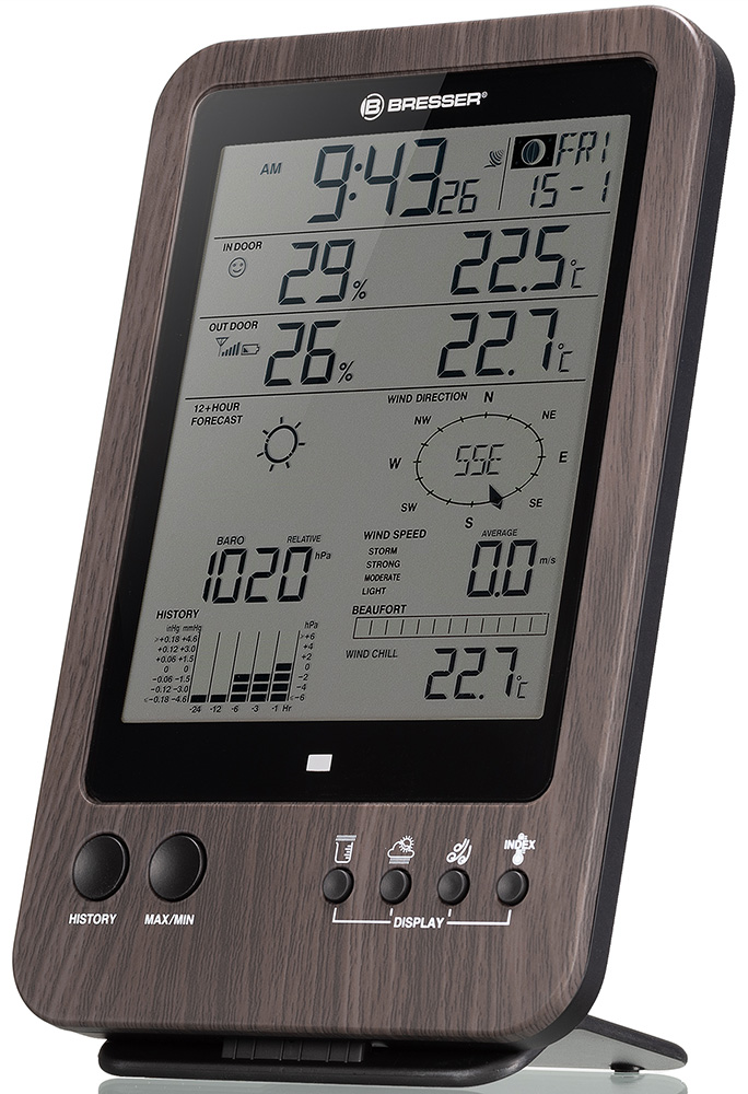 Перед вами база для метеостанций Bresser «5 в 1» WTW. Она нужна либо для замены сломавшегося основного модуля метеостанции, либо для установки дополнительного – в этом случае оба смогут работать с имеющимися датчиками. База устанавливается на подставку и только внутри помещения, так как она не имеет защиты от влаги.