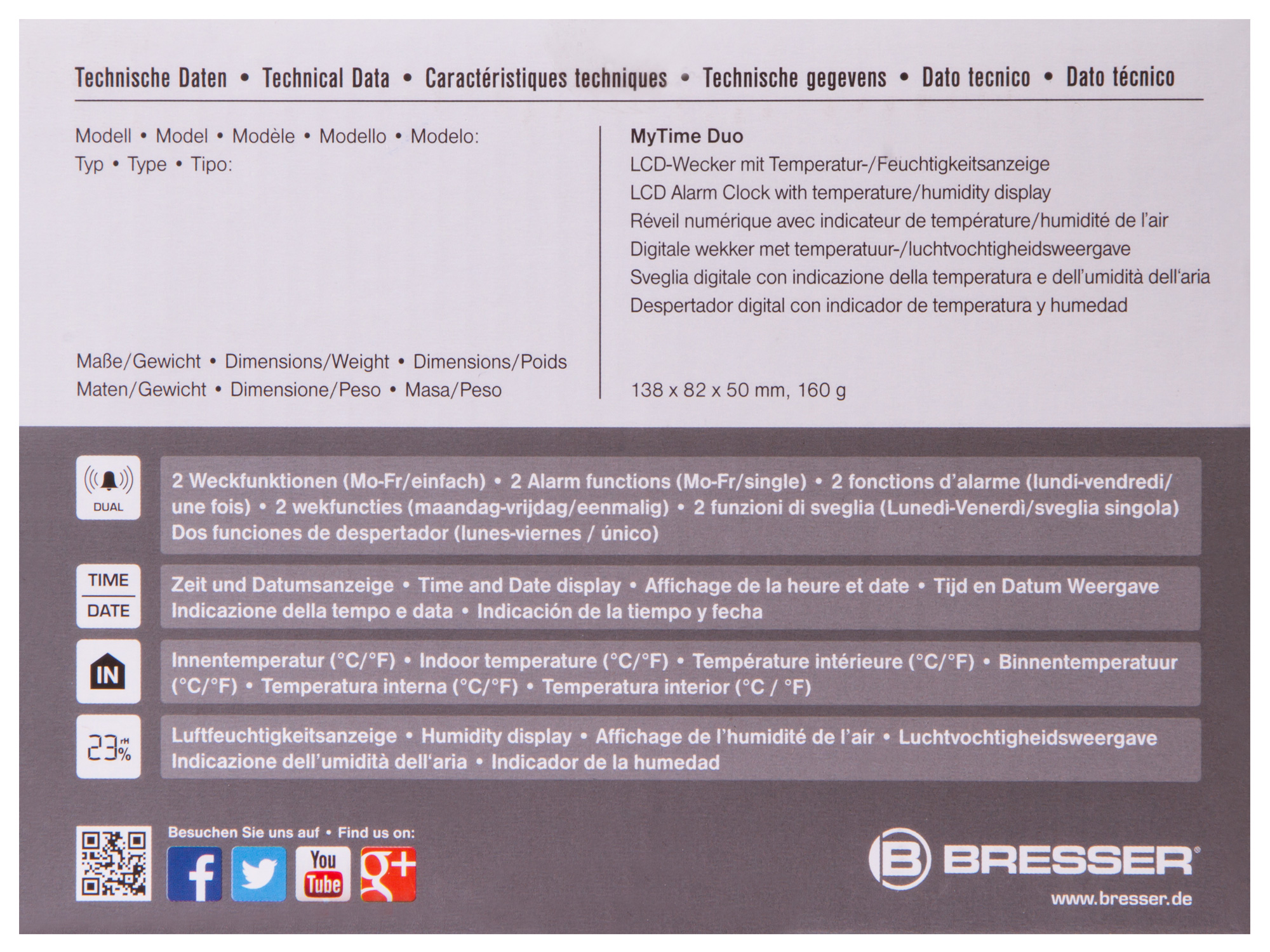 Настольные часы Bresser MyTime Duo LCD не только показывают время и дату, но и отображают информацию о температуре и влажности воздуха в помещении. Это прибор, который совмещает в себе функции классических часов с будильником и простой домашней метеостанции. Часы выглядят стильно и интересно, имеют большой и контрастный ЖК-экран с подсветкой, работают от батареек.