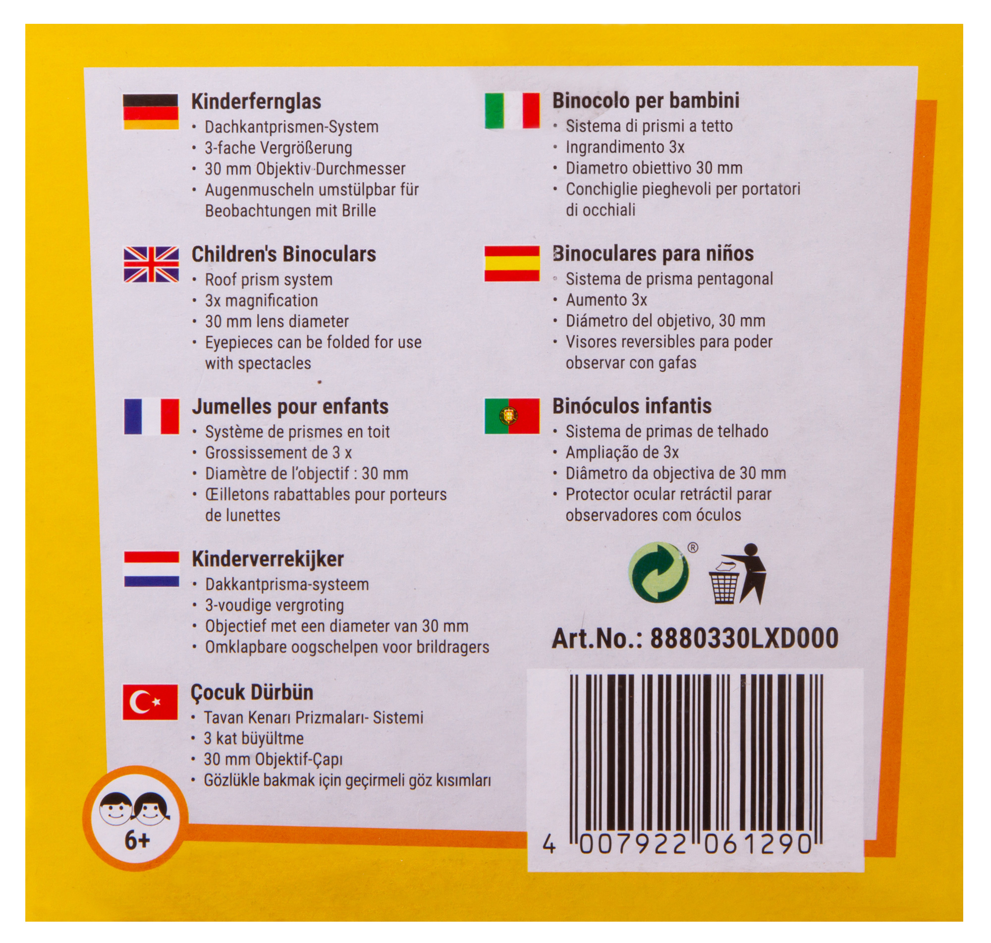 В бинокле установлены современные roof-призмы, благодаря которым он и остается совсем небольшим. Корпус создан с учетом требований маленьких пользователей, поэтому удобно лежит в детской руке. К тому же бинокль легкий и совсем не обременяет на прогулке или в дороге. Оптика дает 3-кратное увеличение, диаметр объективов составляет 30 мм.