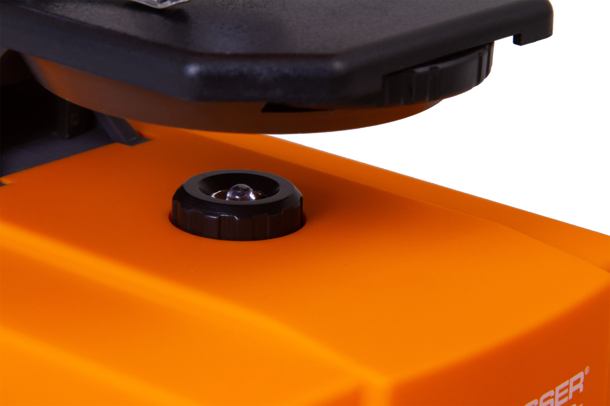 Для фиксирования микропрепаратов на предметном столике используются металлические зажимы. Источник освещения – светодиод, расположенный в нижней части микроскопа. Свет от него проходит через диск с диафрагмами, при помощи которого можно регулировать степень освещенности образца. Яркость подсветки тоже регулируется. Для работы подсветки используются батарейки (в комплекте).