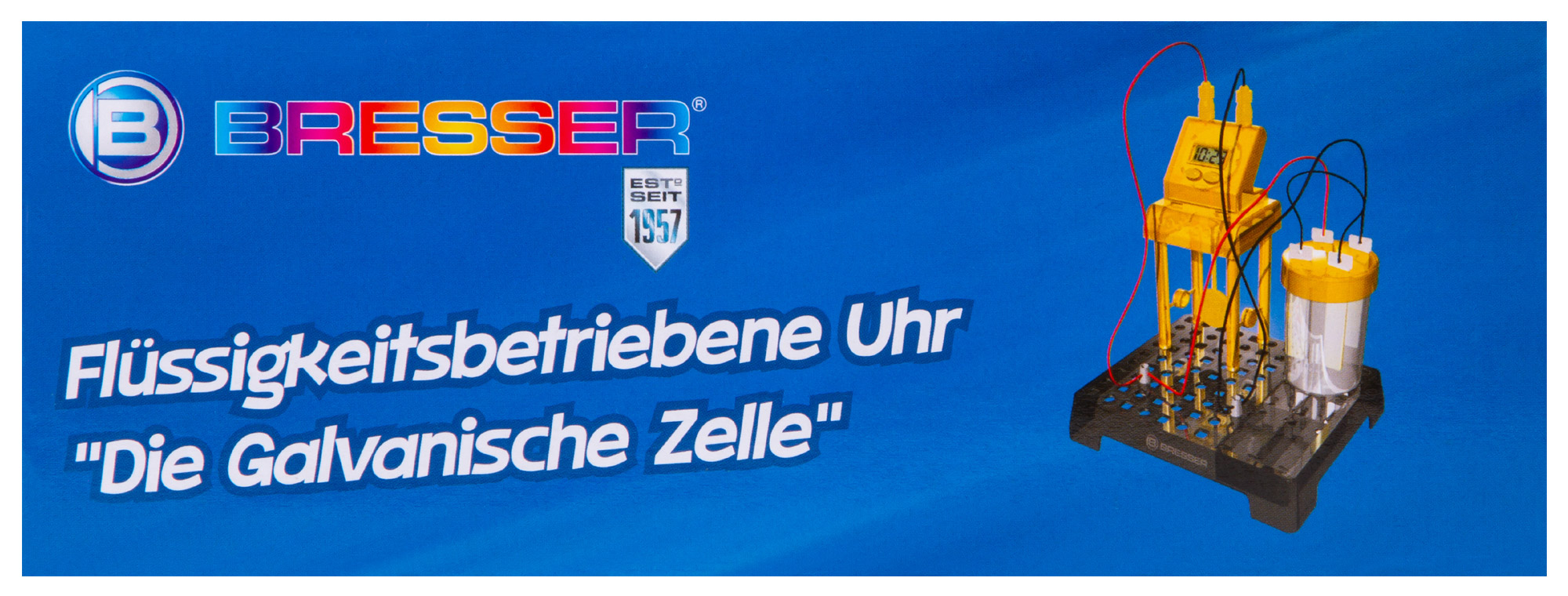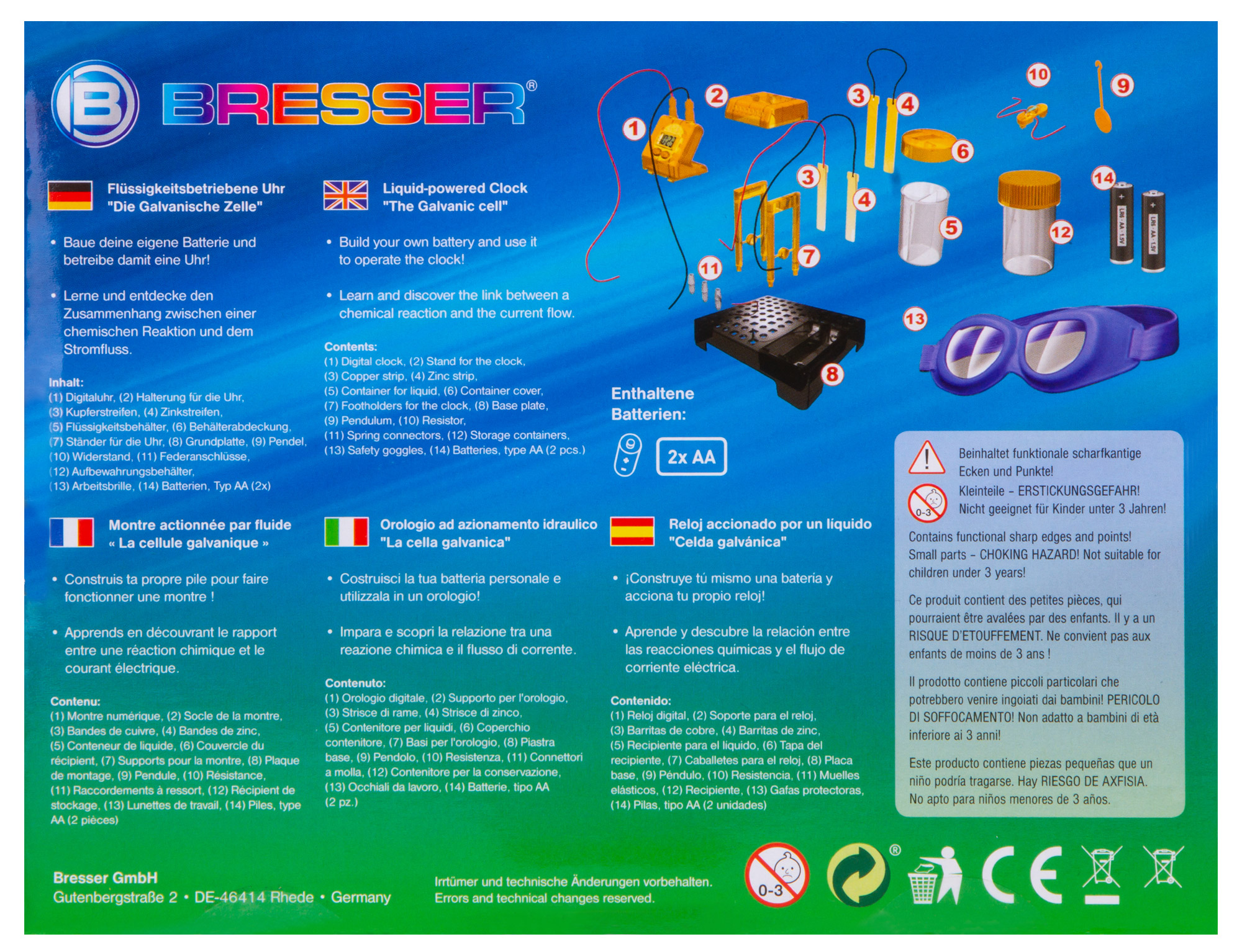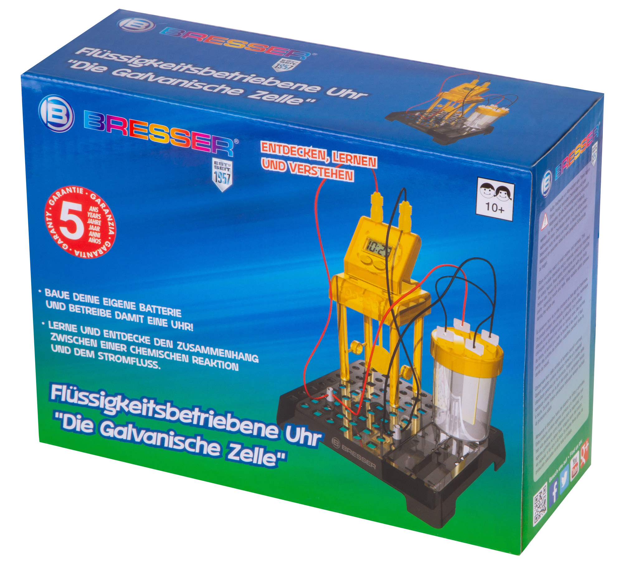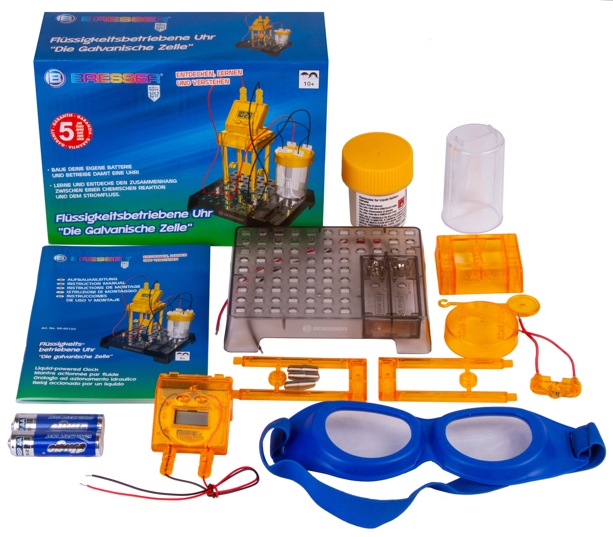 Набор Bresser Junior «Часы на жидкостном аккумуляторе» познакомит юного исследователя с основами химии и физики и даст возможность увидеть, как химическая реакция между двумя металлами может привести к возникновению в цепи электричества. С помощью этого набора можно собрать работающий аккумулятор и подключить его к цифровым часам, которые станут показывать время и текущую дату. Сама сборка несложная, все шаги подробно описаны в прилагаемом руководстве.