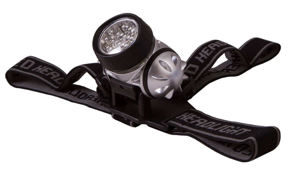В качестве источника света выступают светодиоды. Можно регулировать интенсивность пучка света: 1, 3 и 7 светодиодов. Переключение осуществляется одной кнопкой. Она же отвечает и за включение и выключение фонаря. На голове конструкция фиксируется мягким текстильным ремнем, длину которого можно регулировать. Для питания используются три батарейки типа ААА.