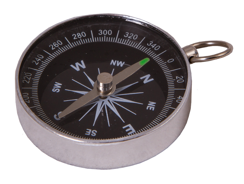 Классический компас с магнитной стрелкой – удобный и надежный инструмент для ориентирования на суше и воде. Его стрелка всегда указывает на север. Чтобы не потерять компас в дороге, его можно повесить на шнурок или цепочку – в верхней части есть специальное ушко-крепление.