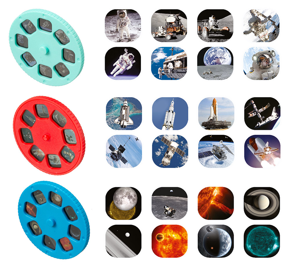 В режиме проектора прибор создает проекцию на потолок или стену. Для этого используются специальные диски со слайдами (в комплекте из 3, всего для изучения доступно 24 изображения). Все слайды посвящены космосу и астрономии, на них показаны планеты, галактики, космические аппараты и многое другое.