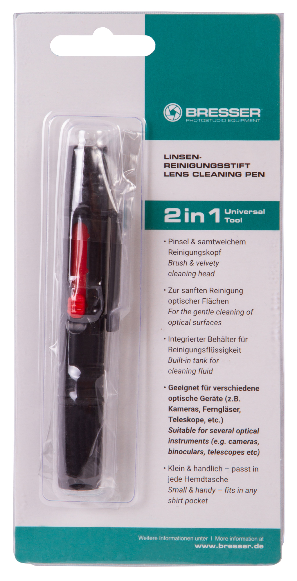 Чистящий карандаш Bresser BR-LP10 – аксессуар, который должен быть у каждого владельца оптического прибора или фототехники. Это специальный инструмент для очищения линз от загрязнений, не повреждающий просветляющее покрытие и не оставляющий царапин. С одной стороны карандаша находится мягкая кисточка – она убирает пыль и мелкие ворсинки. С другой стороны расположена губка – она тщательно очищает линзы от пятен и грязи.