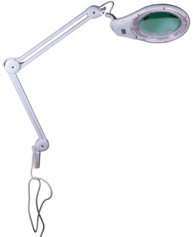 Диаметр линзы составляет 175 мм. На оправе вокруг нее размещены 108 ярких светодиодов. Подсветка питается от сети переменного тока через встроенный адаптер. Яркости светодиодов достаточно, чтобы работать даже в полной темноте. Складной настольный кронштейн сгибается в трех точках и легко фиксируется в нужном положении. Вы можете свободно регулировать положение и угол наклона линзы.
