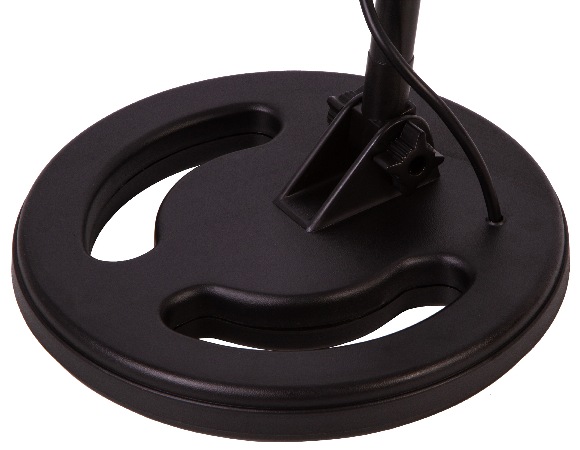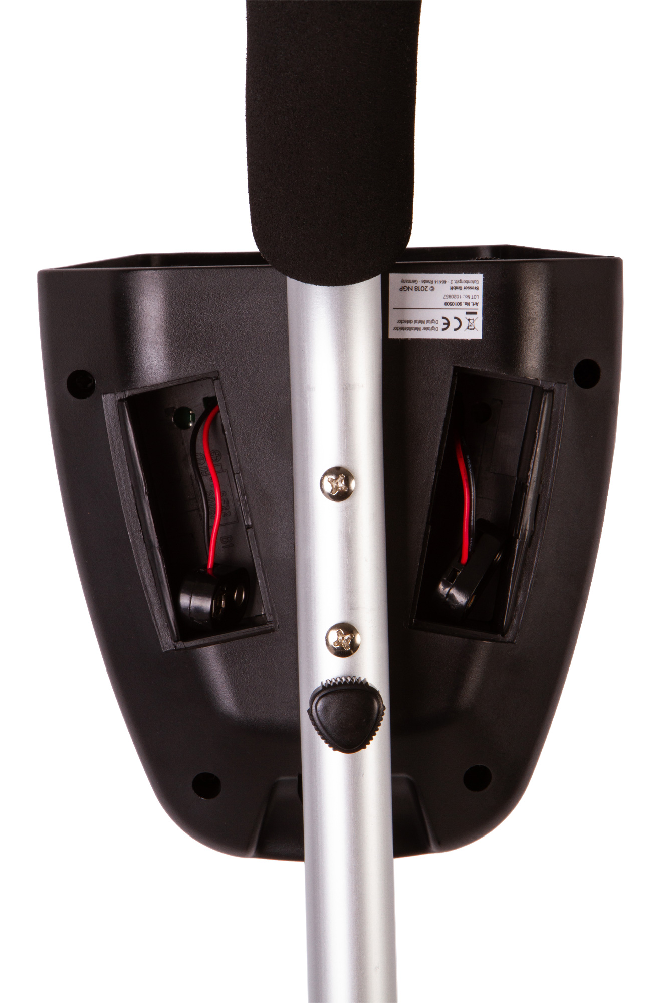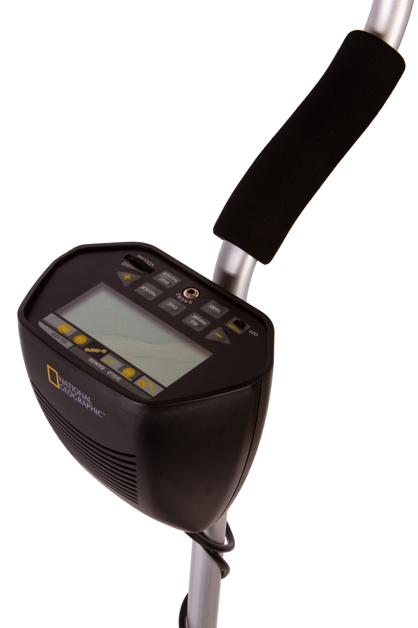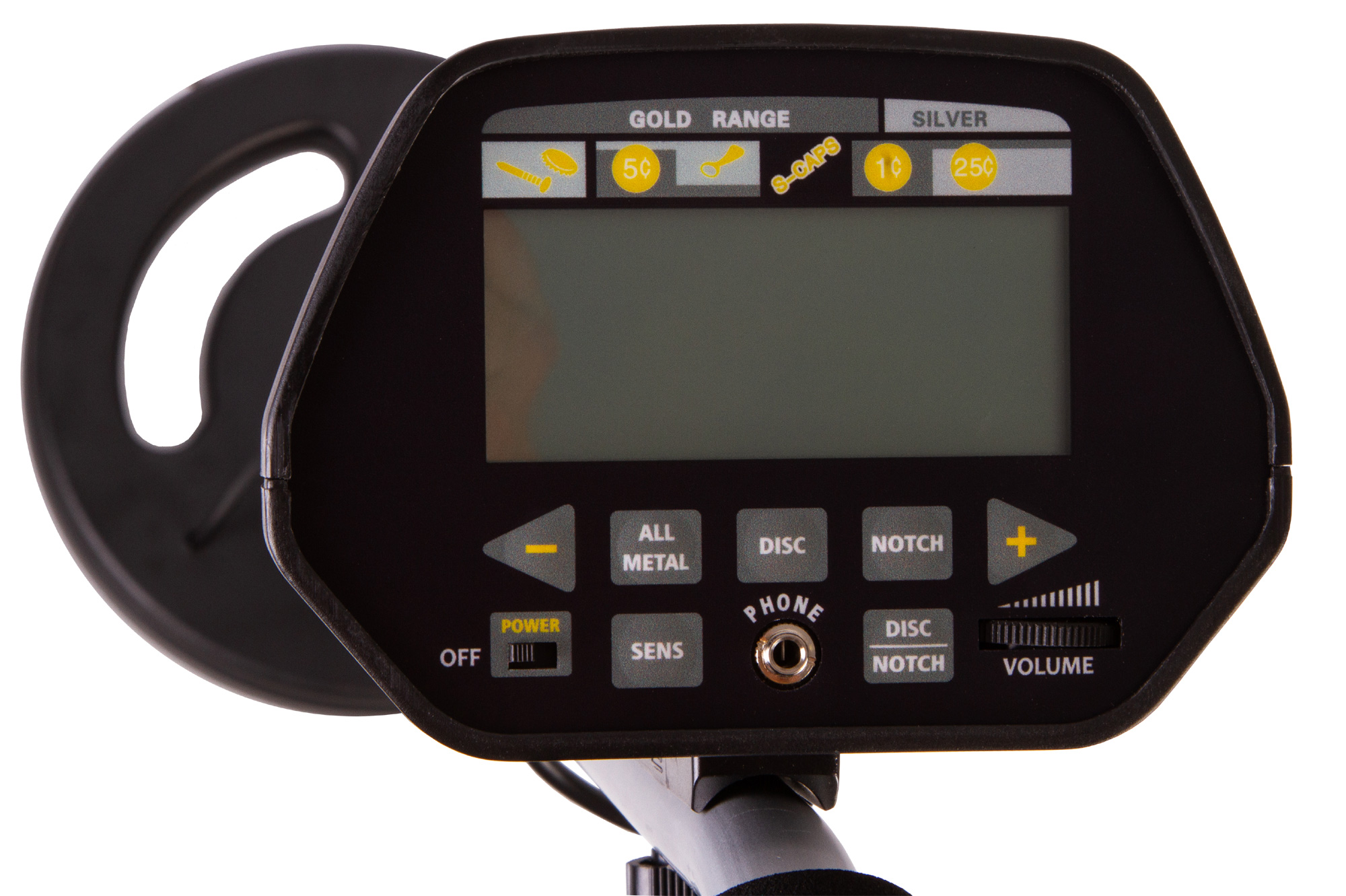 Блок управления расположен на телескопической ручке и снабжен ЖК-экраном. Благодаря динамику металлоискатель также уведомляет об обнаружении звуковым сигналом. Громкость сигнала можно регулировать, предусмотрен разъем для подключения наушников. Еще одна особенность прибора – водозащищенный диск, благодаря чему поиск можно проводить в неглубоких водоемах.