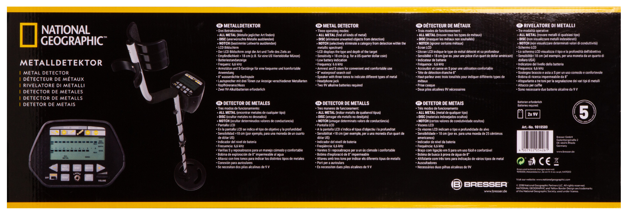 Металлоискатель Bresser National Geographic пригодится любому начинающему кладоискателю. Он удобен тем, что можно выбирать тип металла для поиска, а также настраивать чувствительность. Прибор уверенно обнаруживает мелкие монеты на глубине до 20 см, а крупные металлические объекты может найти и на более глубоком уровне залегания.