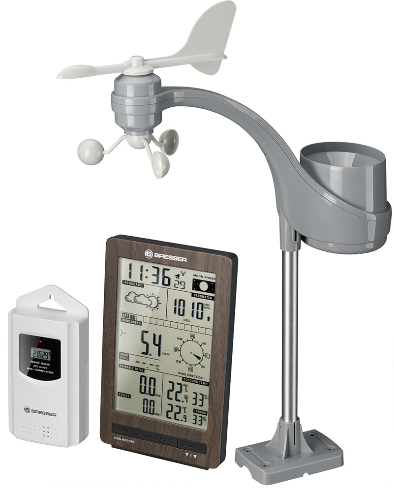 Профессиональная метеостанция Bresser ClimaTemp FW позволяет следить за всеми капризами погоды. В комплекте идут два метеодатчика, которые измеряют температуру и влажность воздуха, определяют направление и скорость ветра, подсчитывают количество выпавших осадков и информируют об изменении давления. Это настоящий метеоцентр, который можно разместить в городской квартире или загородном доме. Обратите внимание на внешний вид прибора – корпус под дерево отличает эту модель от многих других, она прекрасно подойдет к классическому интерьеру. Метеодатчики Один из датчиков – это стандартная компактная модель, измеряющая только температуру и влажность воздуха. Для его работы требуются батарейки, данные с датчика на метеостанцию передаются по радиоканалу на расстояние до 80 метров. Второй датчик измеряет скорость ветра, определяет его направление, а также является дождемером. У него нет батарейного отсека, он подключается к термогигродатчику при помощи кабеля (в комплекте, длина кабеля – 9,5 метров). Оба датчика предназначены для установки снаружи помещения. Информация на экране На экране метеостанции выводится вся информация о погоде и другие полезные данные. В верхней части показываются время, фаза Луны, иконка прогноза погоды и показания барометра. Ниже располагаются: уровень силы ветра по шкале Бофорта, значение скорости ветра и его температура, направление ветра. Нижняя часть экрана отведена под осадки (за день и за весь период измерений), температуру и влажность воздуха внутри и снаружи помещения. Особенности: