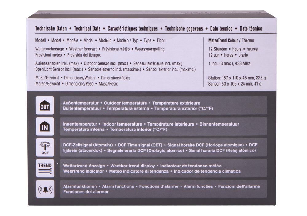 Bresser MeteoTrend Colour – метеостанция с цветным экраном, на котором отображаются температура снаружи и внутри помещения, прогноз погоды на ближайшие 12 часов, текущее время, дата и день недели. Благодаря яркой белой подсветке символы на экране четко видны даже в полной темноте. Метеостанция легко настраивается и заменяет собой сразу несколько приборов: часы с будильником, термометр и гигрометр.