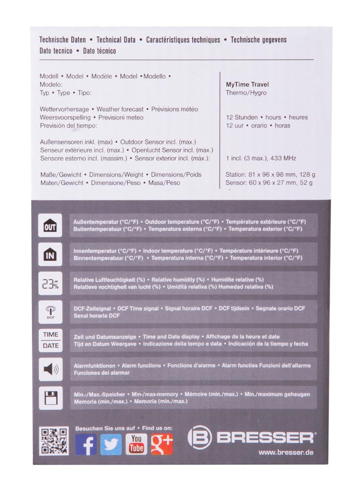 Bresser MyTime Travel Alarm Clock – это метеостанция и часы-будильник в одном компактном и легком корпусе. Она идеально подойдет тем, кто много путешествует. Так как для питания используются батарейки, а наружный датчик подключается без проводов, метеостанцию можно установить в любом месте. На цифровом экране отображается вся необходимая информация: температура и влажность воздуха внутри и снаружи помещения, текущее время, дата и день недели. Метеостанция умеет оценивать и общий уровень комфорта в комнате – небольшая иконка указывает на слишком сухой, оптимальный или чрезмерно влажный воздух. Встроенные часы автоматически синхронизируются через радиосигнал. Есть функция будильника с режимом повтора (через каждые 5 минут). Сигнал будильника может звучать и при достижении определенной температуры. Для измерений вне помещения используется наружный датчик. При необходимости к метеостанции можно подключить до трех таких датчиков (приобретаются отдельно). Основные особенности: - Небольшие цифровые часы-метеостанция с будильником