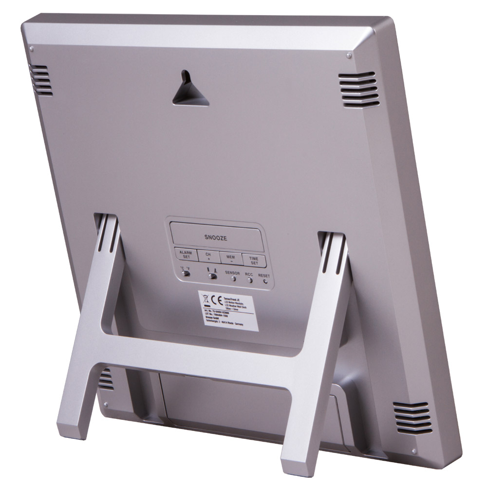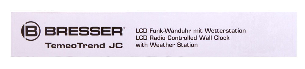 Bresser TemeoTrend JC LCD – метеостанция и настенные часы в одном приборе. Он умеет измерять температуру и влажность воздуха, составлять прогноз погоды на ближайшее время, а также показывает текущее время. Есть функция будильника. Метеостанция комплектуется наружным датчиком, поэтому измерения можно проводить сразу в двух местах одновременно – внутри дома и на улице. К метеостанции можно подключить до 3 таких датчиков (приобретаются отдельно). Вся информация выводится на монохромный цифровой экран. Символы крупные и четко различимые даже с большого расстояния. Верхняя половина экрана занята часами, в нижней расположен блок прогноза погоды и блоки наружной и внутренней температуры и влажности воздуха. Небольшой экран есть и на датчике – на нем отображаются только измеряемые им показания. При подключении датчиков не используются провода – вся информация передается по радиоканалу. Для питания используются батарейки (нет в комплекте, необходимы и для основного модуля, и для наружного датчика). Основные особенности: - Широкий экран с крупными символами, видимыми на большом расстоянии