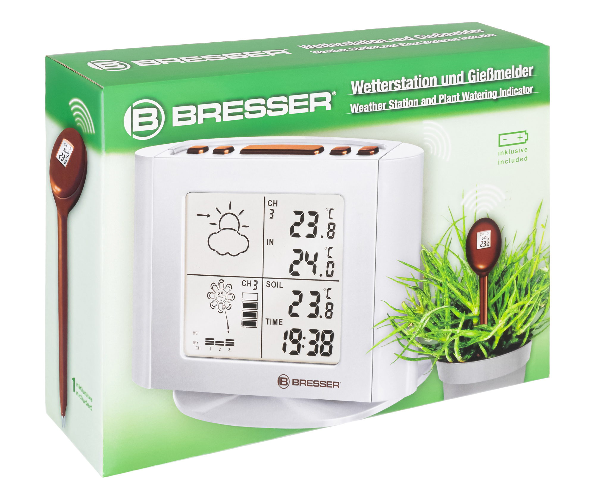 Метеостанция Bresser с индикатором полива растений пригодится тому, кто заботится о комнатных растениях и хочет быть уверенным в том, что они растут в идеальных условиях. Включенный в комплектацию беспроводной датчик устанавливается в почву, в которой произрастает горшочное растение, и в режиме реального времени следит за изменениями температуры воздуха, а также температуры и влажности почвы. О любых негативных изменениях датчик уведомляет незамедлительно. Всего к метеостанции можно подключить до пяти таких датчиков.