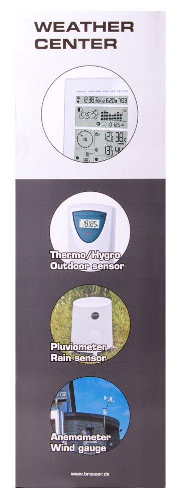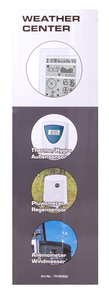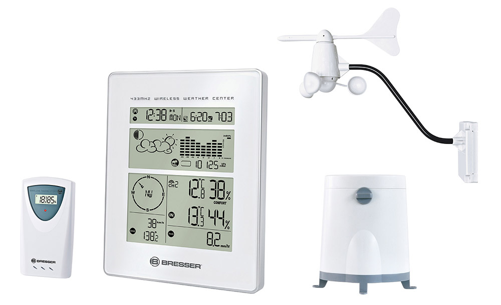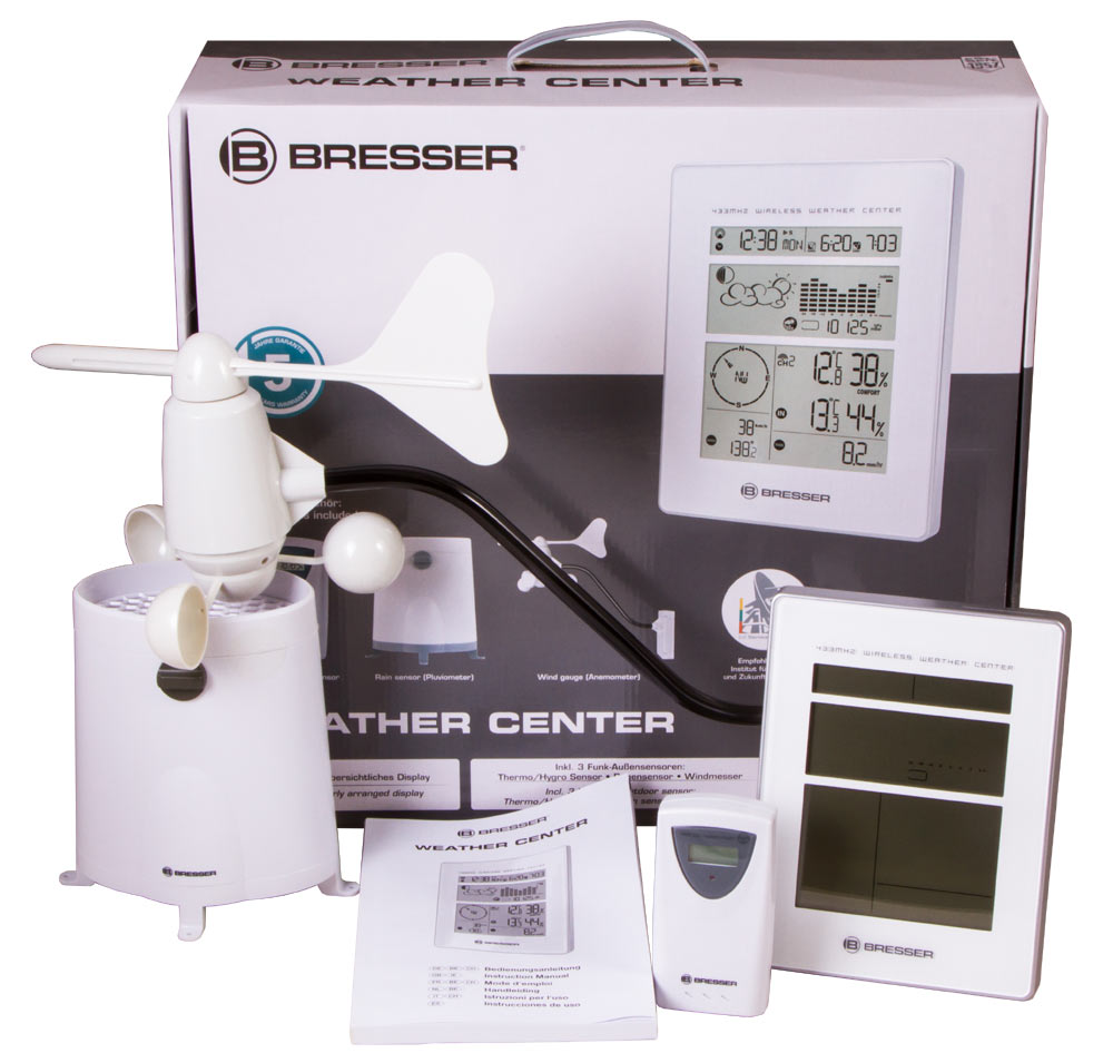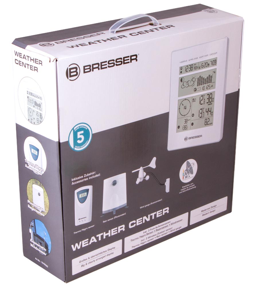 Перед вами не просто метеостанция, а настоящий многофункциональный гидрометеорологический центр. Он состоит из основного модуля, на котором отображаются все данные, и нескольких беспроводных датчиков – термометра, гигрометра, барометра, дождемера и ветромера. Благодаря этой метеостанции вы будете знать все о погоде: когда пойдет дождь, ожидается ли повышение давления, каковы температура и влажность воздуха за окном и в вашей квартире. Кроме того, в метеостанцию встроены часы с будильником и календарь. И основной модуль, и датчики не требуют проводного подключения. Они взаимодействуют друг с другом через радиоканал, связь остается стабильной на расстоянии до 100 метров. Вся собранная информация отображается на экранах метеостанции – всего их три. На верхнем экране показываются текущее время, день недели и время восхода и заката. На часах можно установить будильник. Есть функция повтора. Левая часть среднего экрана отображает текущую фазу Луны и прогноз погоды на ближайшее время. Эта информация представлена в виде иконок, значение каждой подробно описывается в инструкции. В правой части среднего экрана выводится информация о давлении – не только текущем, но и предыдущие его значения. Метеостанция строит график изменения атмосферного давления за прошедшие 24 часа и дает прогноз, будет оно расти или понижаться. На нижнем экране показываются направление и скорость ветра, температура и влажность воздуха внутри и снаружи помещения, прогноз по осадкам. Метеостанция с радиоуправлением Bresser – профессиональный прибор, который позволит вам быть в курсе любых погодных изменений! Основные особенности: - Многофункциональный метеорологический центр