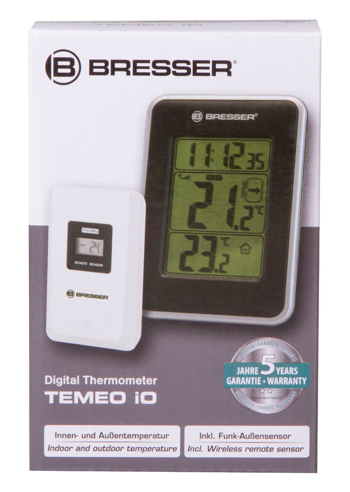 Bresser Temeo io – небольшая и легкая метеостанция со встроенными часами. Она измеряет температуру внутри и снаружи помещения и отображает текущее время. Благодаря питанию от батареек метеостанцию можно устанавливать где угодно – на даче или в городской квартире – и даже брать с собой в путешествие. Наружный датчик подключается без проводов и передает информацию на расстоянии до 30 метров. На экран Bresser Temeo io выводятся три блока информации. В верхнем указано текущее время, в среднем – температура вне помещения и прогноз ее изменения на ближайшие 6 часов, в нижнем – температура внутри квартиры. На наружном датчике тоже есть небольшой экран, где отображается измеряемая им температура. И датчик, и метеостанция работают от батареек (нет в комплекте). Основные особенности: - Компактная метеостанция для путешествий