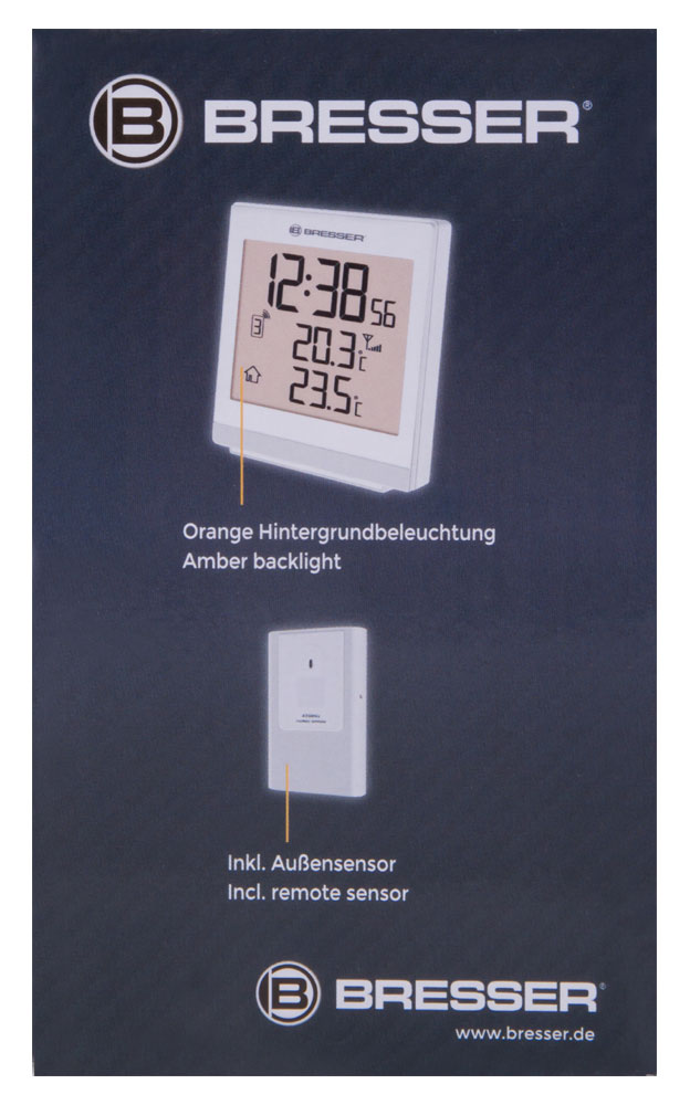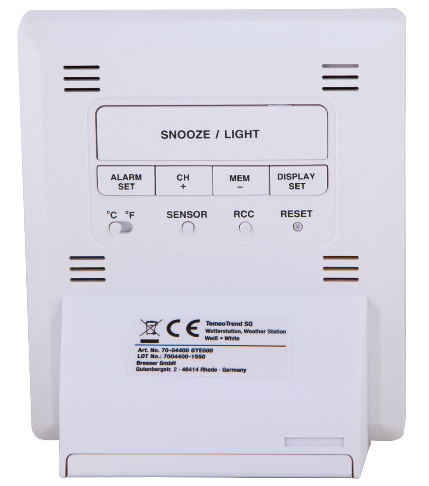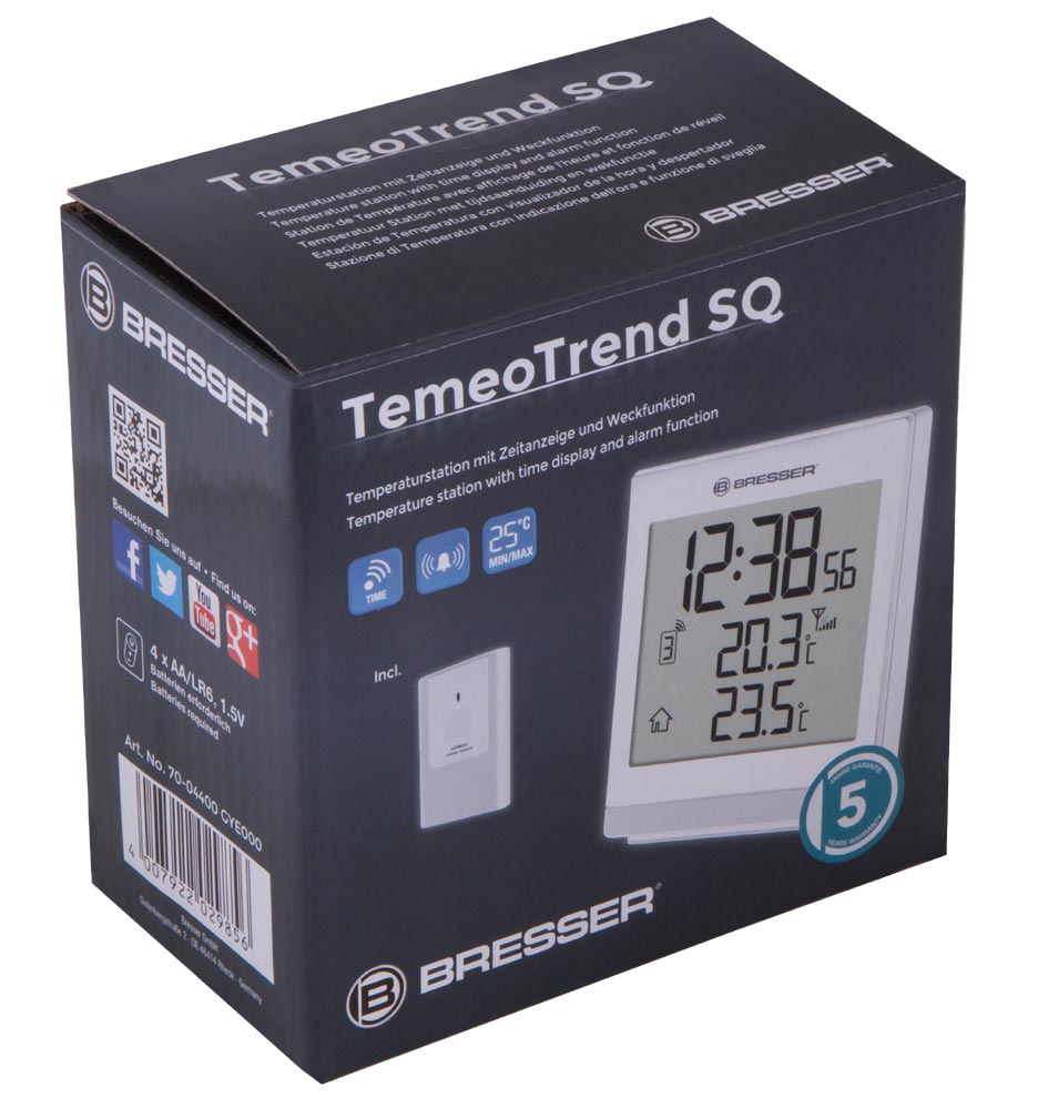 Bresser TemeoTrend SQ – небольшая метеостанция со встроенными часами. Она занимает мало места, хорошо вписывается в любой интерьер, подходит для измерений внутри и снаружи помещения. Есть функция будильника. В комплект поставки включен наружный датчик, который подключается через радиоканал. Половину экрана метеостанции занимают цифровые часы. Индикация четкая и понятная. Под ними сразу же выводится информация о текущей температуре, которую измеряют основной модуль и наружный датчик. Для подключения метеостанции не требуются провода. Для питания используются батарейки (нет в комплекте), а информация с датчика передается по радиоканалу. Основные особенности: - Компактный и элегантный корпус белого цвета