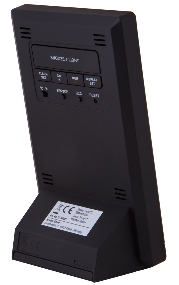 Bresser TemeoTrend ST – стильная домашняя метеостанция со всем необходимым функционалом. Она показывает время, измеряет температуру внутри и снаружи помещения, составляет прогноз погоды на ближайшие 12 часов. Кнопки управления расположены сзади, поэтому не портят внешний вид метеостанции. Bresser TemeoTrend ST комплектуется наружным датчиком, который можно установить на расстоянии до 30 метров от основного модуля. Датчик предназначен для измерений вне помещения, основной модуль – внутри него. Вывод температуры на экран можно настроить как в градусах Цельсия, так и в градусах по Фаренгейту. Метеостанция заменяет собой и настольные часы. Благодаря встроенному будильнику с функцией повтора вы будете все успевать вовремя. Для работы метеостанции требуются батарейки, которые не входят в комплект поставки. Основные особенности: - Измеряет температуру внутри и снаружи помещения