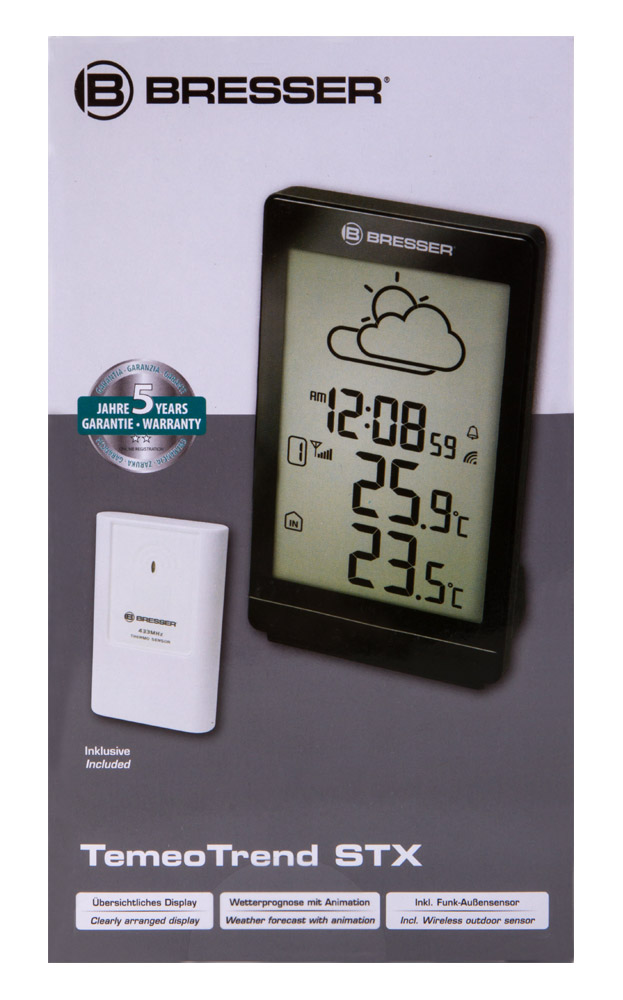 Bresser TemeoTrend STX – домашняя метеостанция с дополнительным радиодатчиком. Она снабжена цифровым монохромным экраном, показывает прогноз погоды на ближайшие 12 часов, текущее время и температуру внутри и снаружи помещения. Метеостанцию можно поставить на полку, стол или подоконник или закрепить на стене. Благодаря крупной индикации и контрастной янтарной подсветке показания с экрана хорошо читаются даже при слабой освещенности и с большого расстояния. На наружном датчике нет встроенного экрана. Всю информацию можно прочитать только на основном модуле. В верхней части его экрана отображается анимированная иконка прогноза погоды. Если температура воздуха попадает в диапазон от -2 °C до 3 °C, рядом появляется индикация снега. Ниже расположен блок часов. Еще ниже – показания температуры, которые измеряют датчик и основной модуль. Отметим наличие встроенного будильника. Благодаря функции повтора вы никогда не проспите важные моменты своей жизни! И датчик, и метеостанция работают от батареек (нет в комплекте). Основные особенности: - Измеряет температуру внутри и вне помещения, показывает текущее время