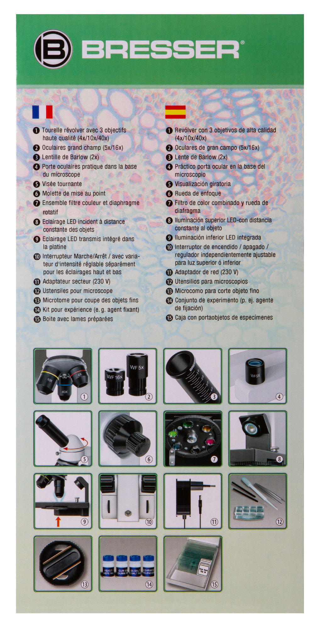Диапазон увеличений микроскопа составляет от 20 до 1280 крат. Насадка имеет небольшой наклон, что делает длительные наблюдения более удобными. В комплекте идут два окуляра с разным увеличением, а также двукратная линза Барлоу. На микроскоп можно устанавливать цифровые камеры Bresser (приобретаются отдельно). Револьверное устройство вмещает три объектива разной кратности.