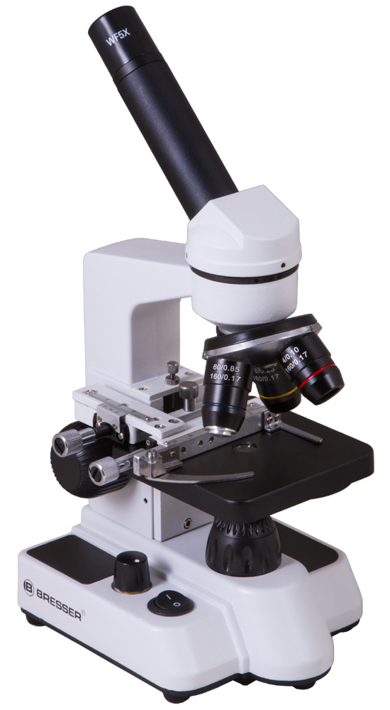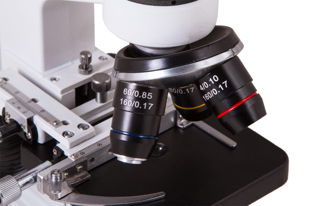 Оптическая система микроскопа состоит из монокулярной насадки и трехгнездного револьверного устройства. Насадка расположена под углом в 45° и может поворачиваться вокруг своей оси. Благодаря этому удобно вести групповые исследования – нет необходимости перемещать микроскоп целиком, достаточно простого поворота насадки. Объективы уже установлены в револьверное устройство, они дают увеличение в 4х, 10х и 60х. Окуляров тоже три: 5х, 10х и 16х. Они широкоугольные и обеспечивают хороший обзор при наблюдениях. Кроме того, усилить кратность можно и линзой Барлоу 1,6х.