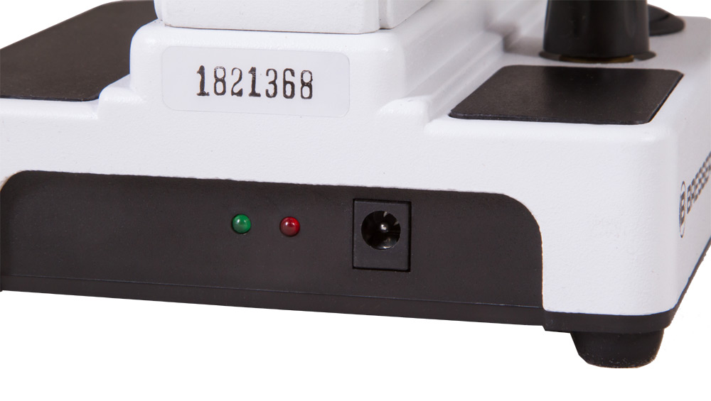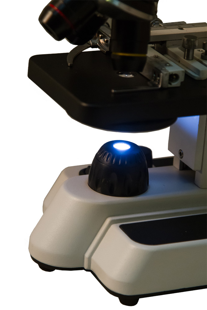 Предметный столик снабжен препаратоводителем и шкалой нониуса. Это позволяет проводить измерения микрообразцов. Система освещения состоит из нижнего светодиода с регулировкой яркости и диска с диафрагмами. Для питания подсветки используется сетевой адаптер (в комплекте) или батарейки (приобретаются отдельно). Корпус микроскопа сделан из металла, поэтому он надежен и долговечен.