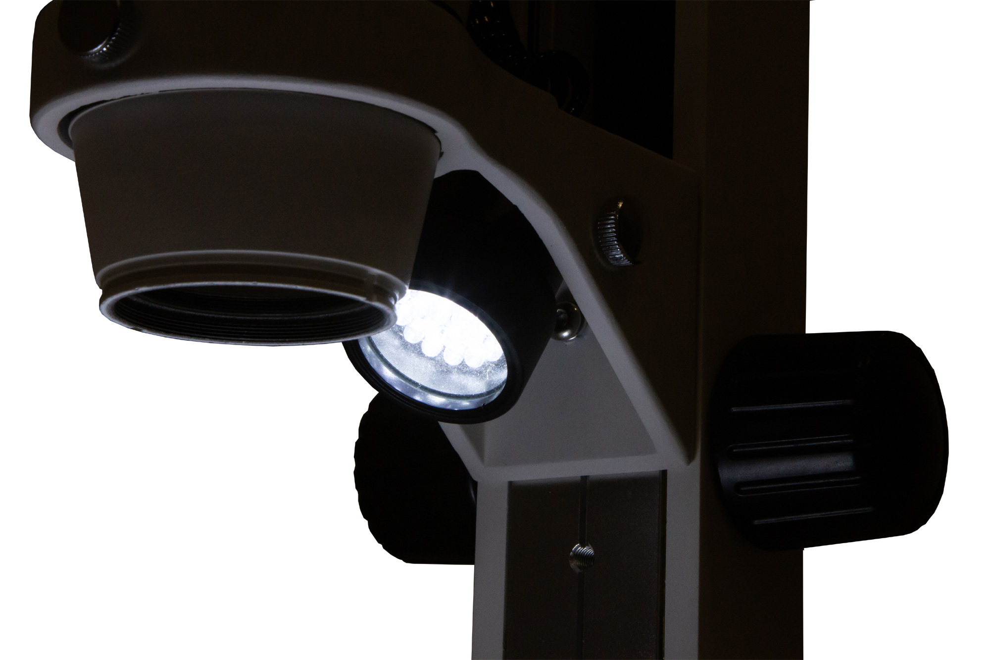 Микроскоп снабжен тринокулярной насадкой. Визуальный узел – классический бинокуляр, для наблюдений используются широкоугольные окуляры с 10-кратным увеличением и возможностью диоптрийной коррекции. Отдельная вертикальная трубка предназначена для установки цифровой камеры (нет в комплекте). Поворотный объектив обеспечивает плавную смену увеличения, общий диапазон кратности микроскопа составляет от 8 до 50 крат.