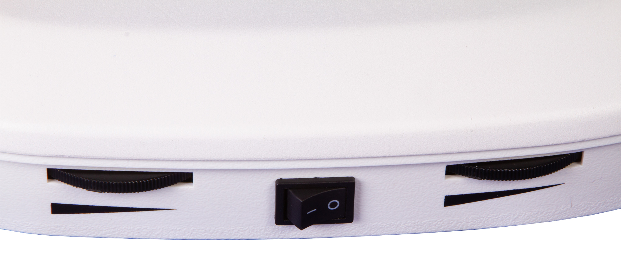 Предметный столик неподвижный и снабжен зажимами для микропрепаратов. Его поверхность можно менять, в комплекте есть матовая пластина из стекла и черно-белая платина из пластика. Освещение расположено по обеим сторонам от предметного столика – сверху и снизу. Яркость светодиодов можно регулировать. Для питания используется сеть переменного тока, также подсветку можно запитать от USB-порта внешнего устройства.