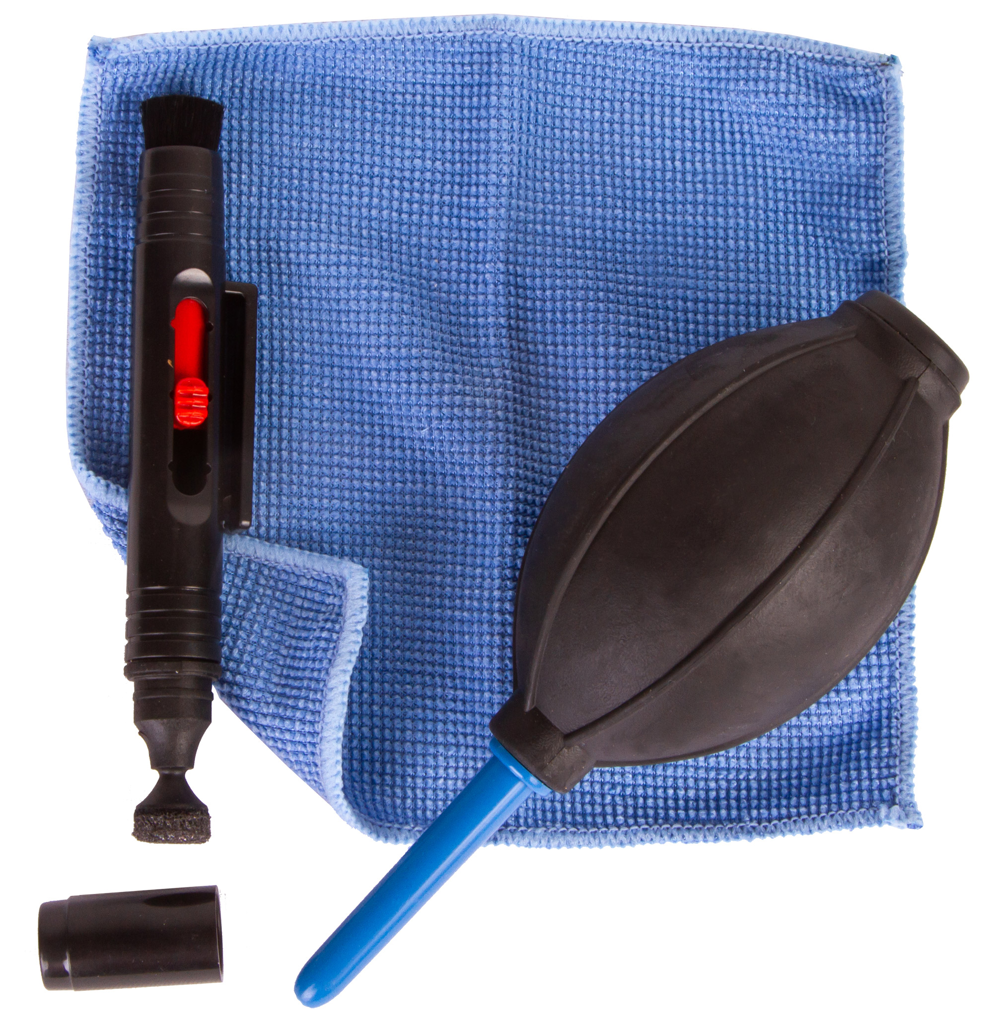 Воздушная груша используется для сдувания частиц пыли с оптики, чистящий карандаш предназначен для тщательного ухода за линзами, в том числе и с просветляющими покрытиями, салфетку можно применять для ухода за разными поверхностями оптических и фотоприборов.