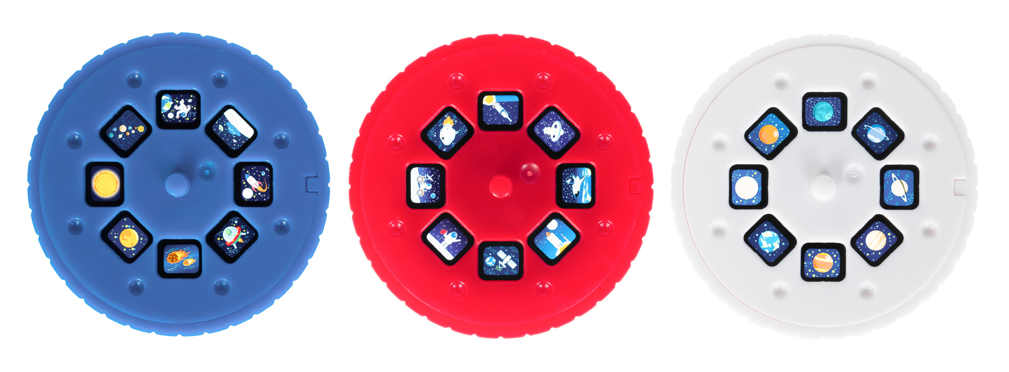 Для проецирования изображений на потолок или стену. В комплекте три диска со слайдами
