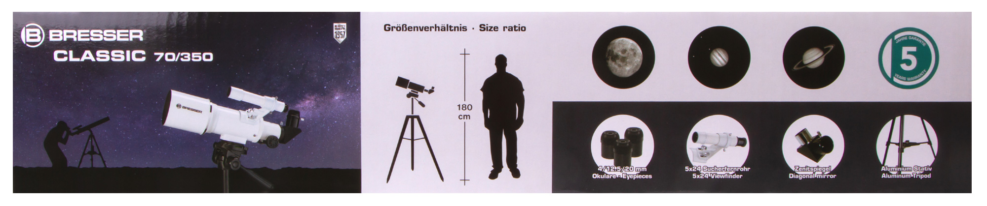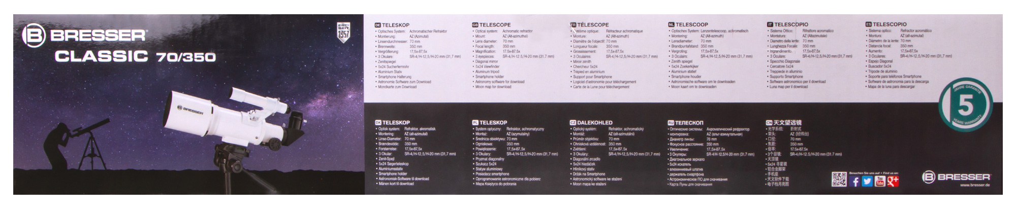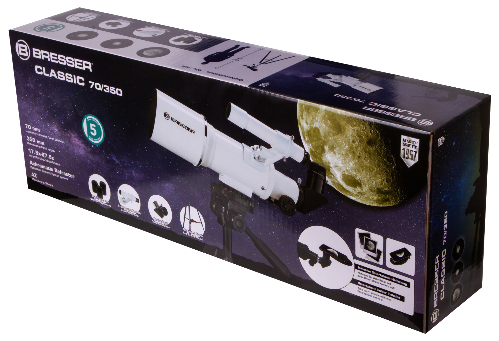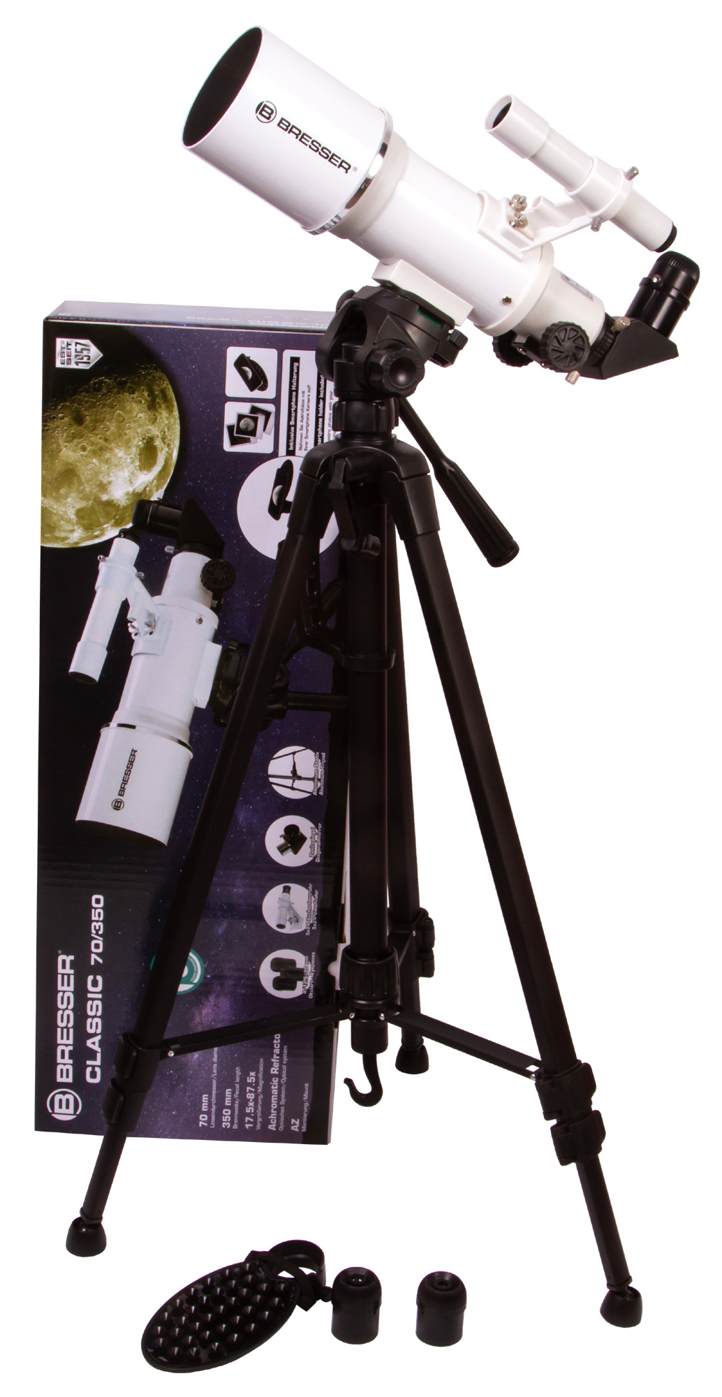 Ахроматический рефрактор Bresser Classic 70/350 AZ – это простое управление, качественное изображение без цветовых искажений и возможность детально изучать ближний космос и наземные объекты. Эта модель интересна богатой комплектацией – здесь есть даже держатель для смартфона, который позволит заниматься астрофотографией. Стоит отметить и высокую светосилу объектива, и небольшие размеры оптической трубы. Bresser Classic 70/350 AZ прекрасно подходит для использования в путешествиях и на загородных астрофестах.
