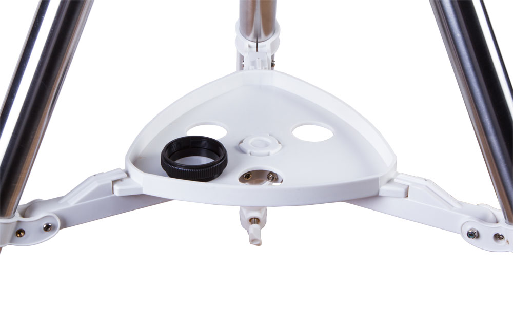 Телескоп комплектуется простой и надежной азимутальной монтировкой, которой сможет управлять даже начинающий любитель астрономии. С ее помощью легко находить объекты на небосклоне – монтировку можно свободно перемещать в четырех направлениях (вверх, вниз, влево и вправо). Телескоп устанавливается на устойчивую стальную треногу с лотком для аксессуаров. Высоту ножек треноги можно регулировать.