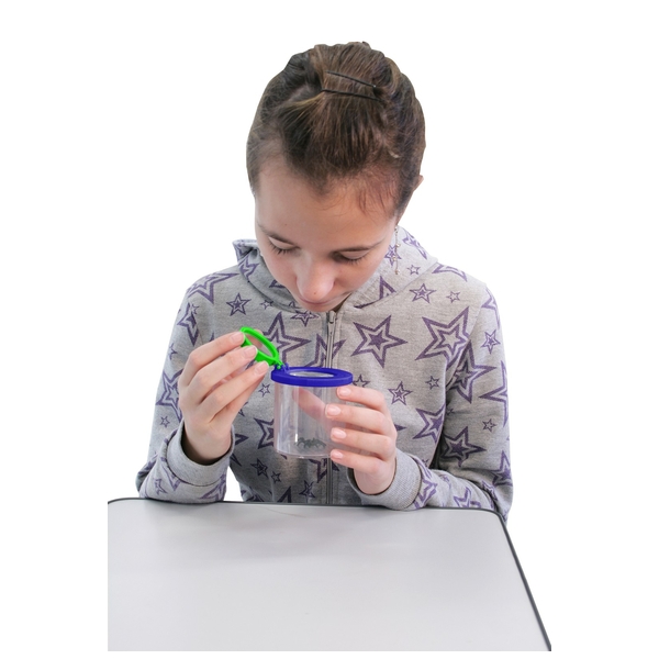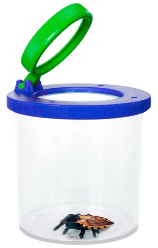 С лупой-стаканом Bresser Junior можно наблюдать за живыми организмами, не причиняя вреда природе. В большой прозрачный стакан поместятся насекомые и даже рыбки (если заполнить его водой). Наблюдать за обитателями бокса можно через прозрачные стенки или с помощью встроенные в крышку увеличительные стекла (2х и 4х). Насекомые или колючие растения внутри бокса не принесут вреда ребенку – поэтому исследования с помощью лупы-стакана Bresser Junior доступны даже совсем маленьким детям. | Технические характеристики | | Материал стенок стакана | оптический пластик | | Материал оптических линз луп | оптическое стекло BK-7 | | Доступные увеличения | 2х и 4х | | Дополнительно | 3 контейнера для хранения, сетка на основании контейнера |