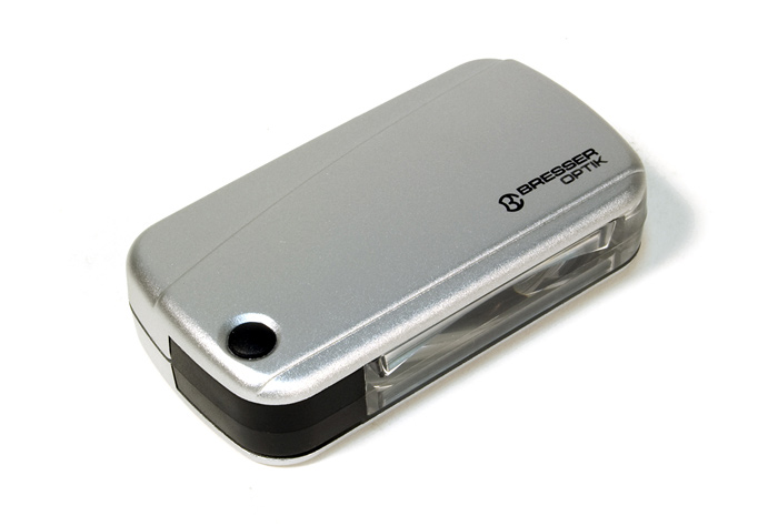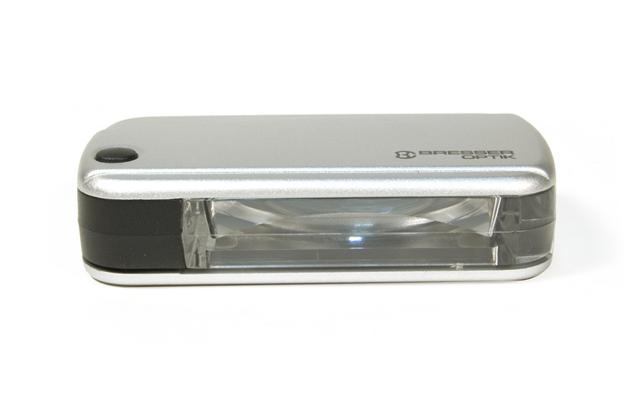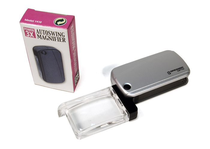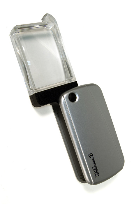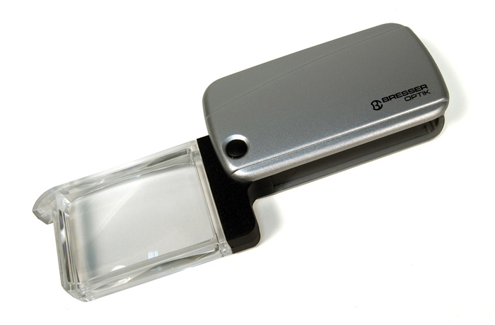 Небольшая и легкая складная просмотровая лупа Bresser – отличный вариант для путешествий. В сложенном состоянии она легко поместится в любой карман. С ее помощью можно читать мелкий шрифт и рассматривать любые предметы, а благодаря небольшому весу такая лупа не будет обременительным грузом в дороге. Линза прямоугольной формы имеет шаговый выдвижной механизм (она раскладывается не плавно, а с определенным шагом). В сложенном состоянии линза убирается внутрь корпуса лупы, что предохраняет ее от царапин. Лупа обеспечивает увеличение 3х.