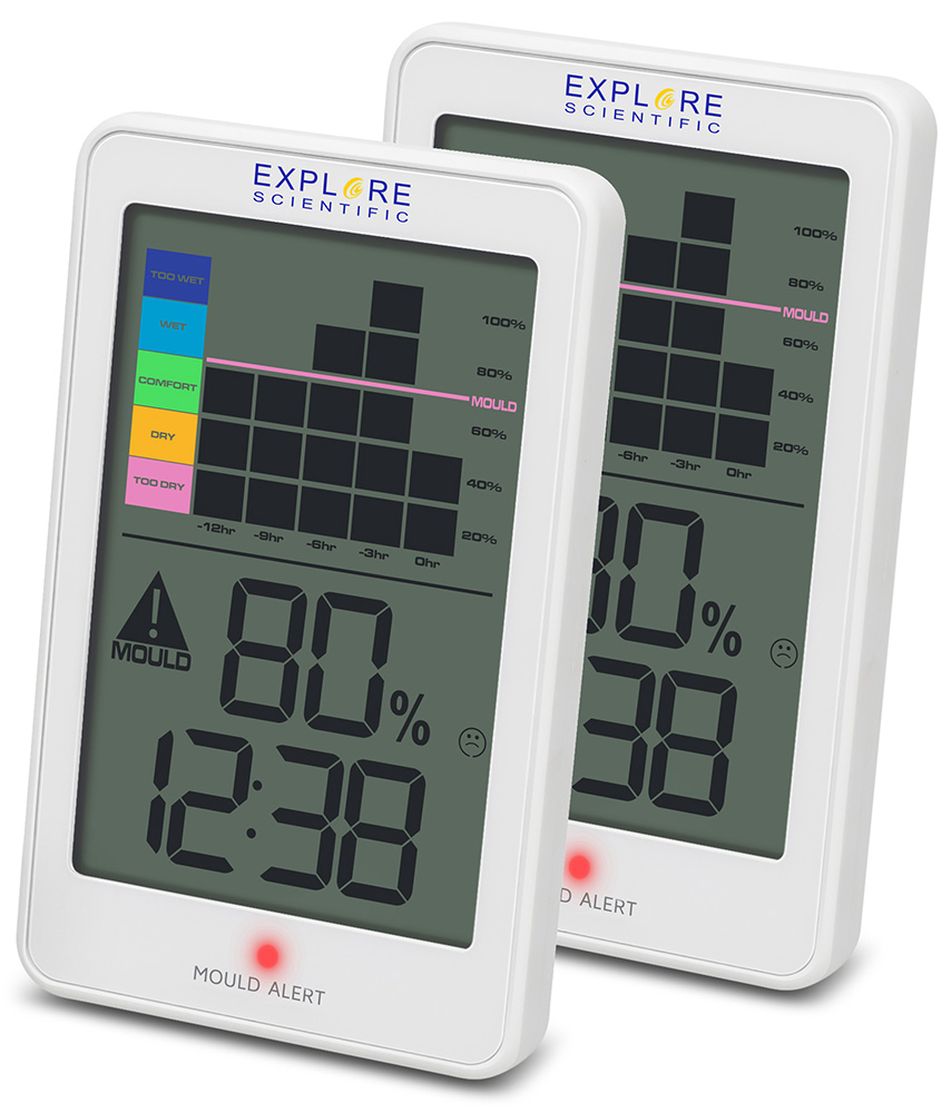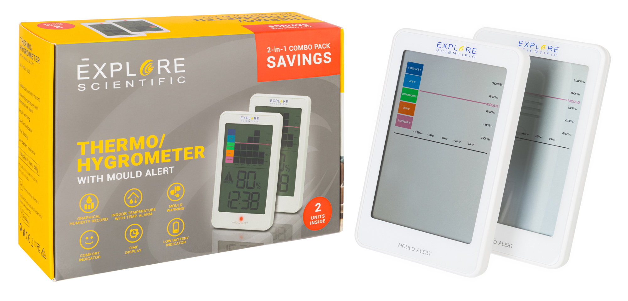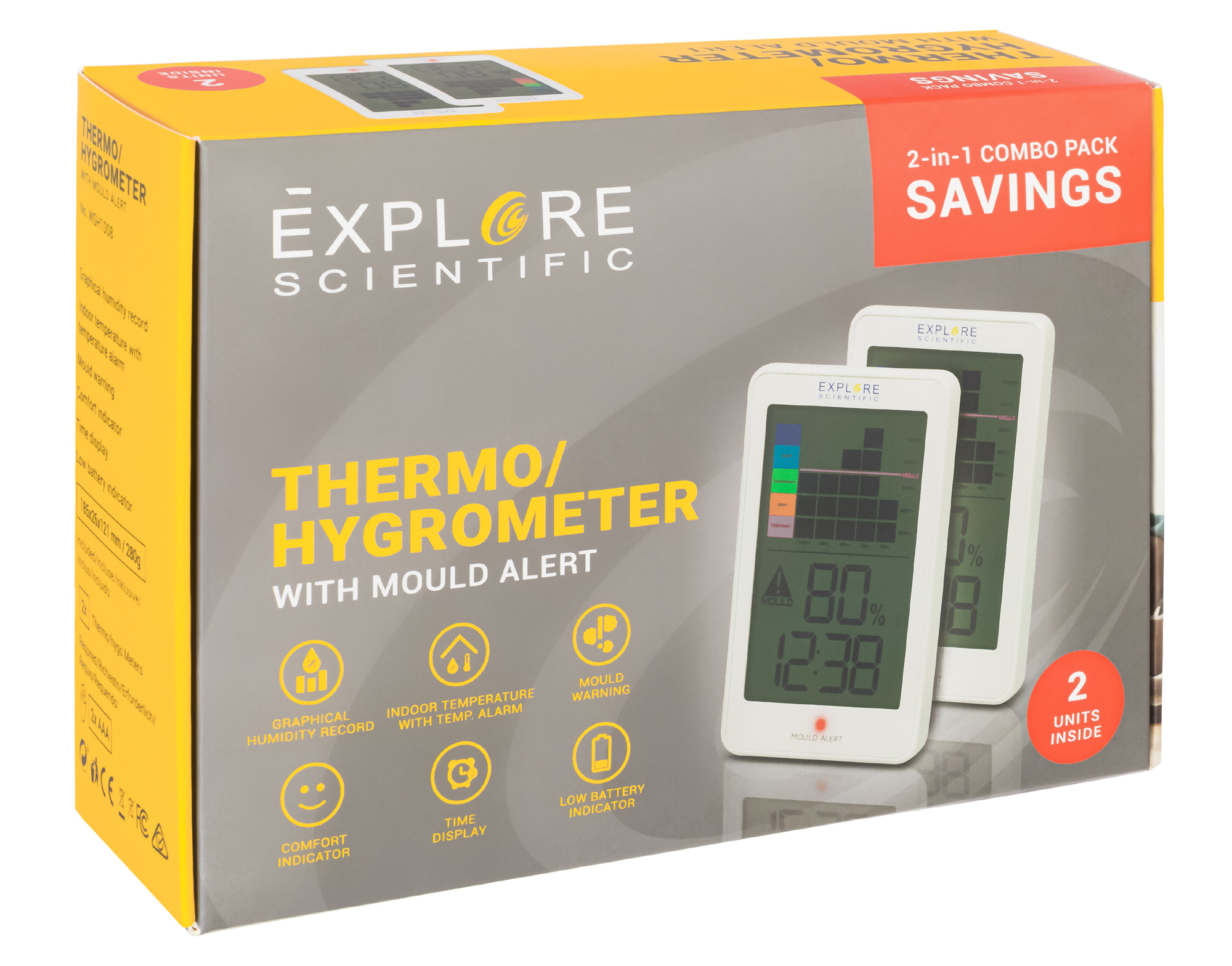 Перед вами набор из двух гигрометров Explore Scientific Mould Alert. Такой прибор необходим каждому, так как помогает быстро реагировать на любые негативные изменения микроклимата дома. Известно, что высокая влажность может привести к появлению плесени, а слишком сухой воздух вреден для самочувствия и может провоцировать возникновение болезней органов дыхания. Гигрометр предназначен для предотвращения таких ситуаций.