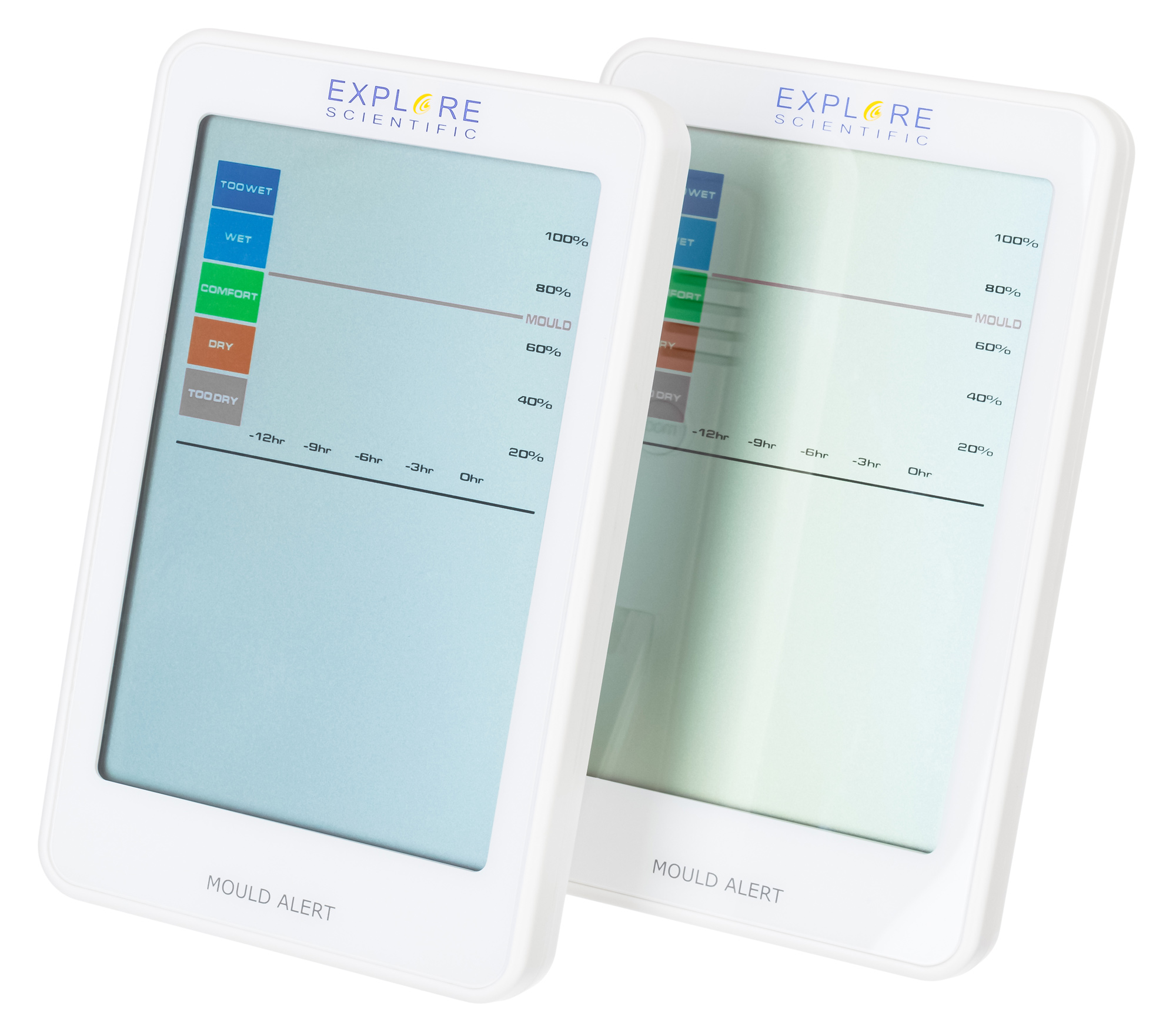 Каждый прибор дополнен экраном, на котором отображаются время, текущая влажность воздуха, а также график ее изменения за последние 12 часов. Рядом с графиком находятся пометки, которые помогают понять, какое значение является нормой, а какое нет. Также на экране появляются предупреждающие символы: грустный смайлик и восклицательный знак. Они показывают, что нужно внимательно проверить уровень влажности в помещении. Гигрометр Explore Scientific Mould Alert, кроме того, измеряет температуру.