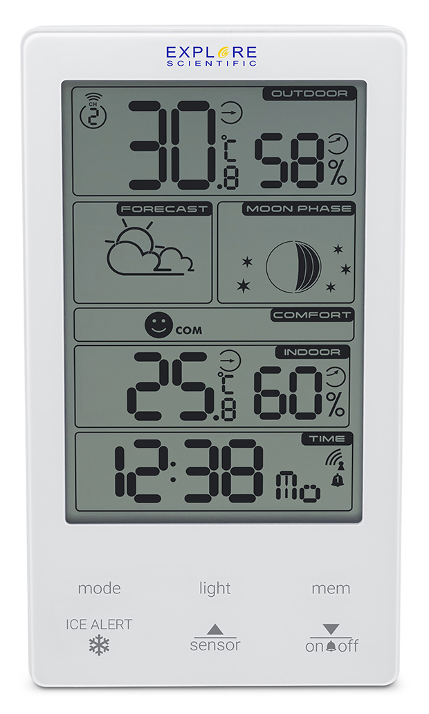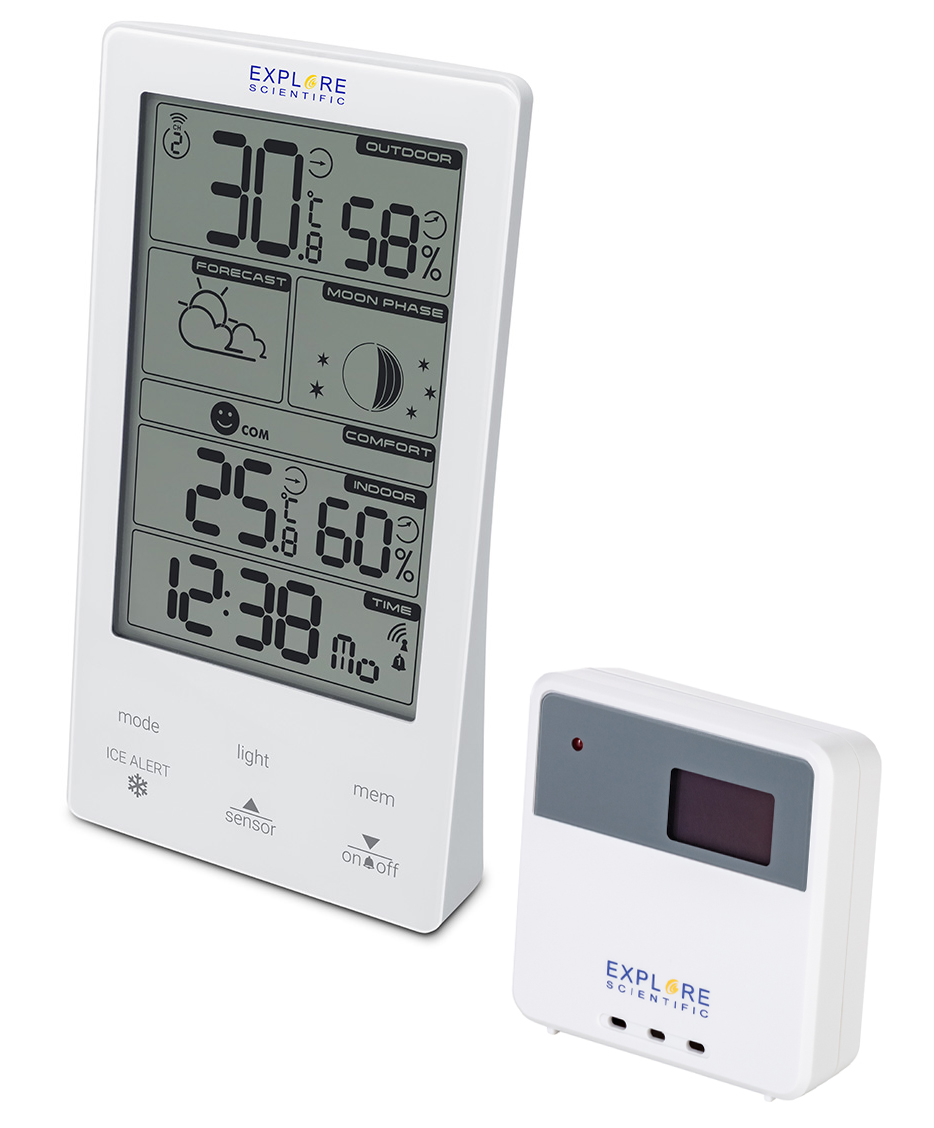 Метеостанция Explore Scientific Classic Vertical с внешним датчиком предназначена для измерения температуры и влажности воздуха. Также она умеет составлять прогноз погоды на 12 часов, показывает время и дату, фазу Луны, может предупредить о заморозках и разбудить на работу сигналом будильника. Это простой в настройке и управлении метеоприбор, который оптимально подходит для размещения в квартире и может одновременно проводить измерения и в помещении, и вне его.