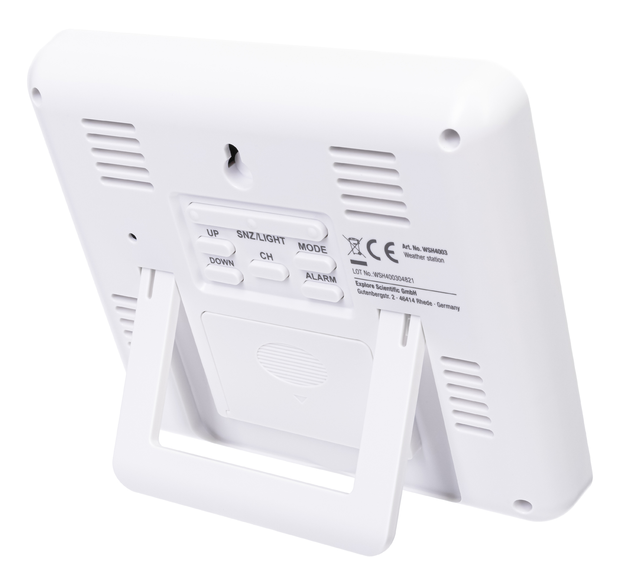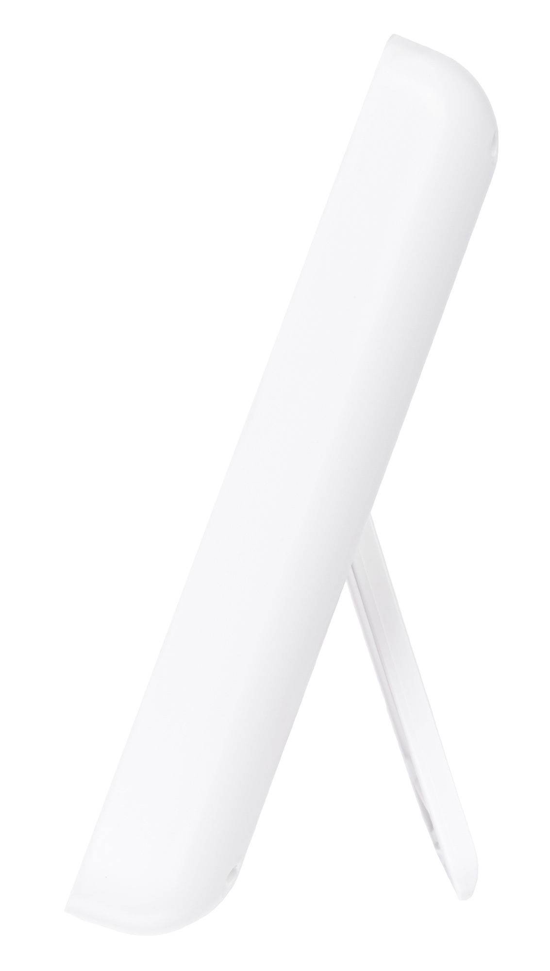 Метеостанция выглядит очень лаконично, в том числе и потому, что с внешней панели убраны кнопки управления. Прибор можно ставить на подставку или вешать на стену. Так как для питания используются батарейки, нет нужды портить интерьер квартиры проводами. Датчик тоже работает от батареек.