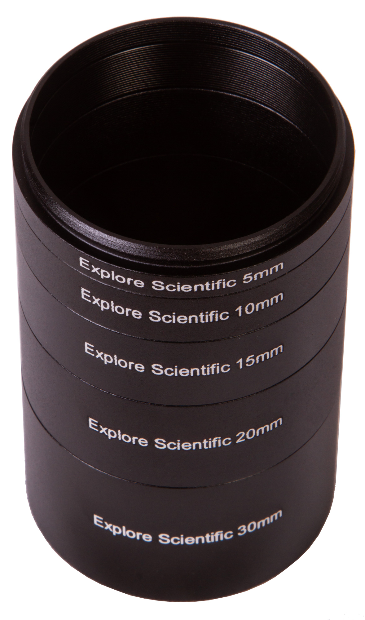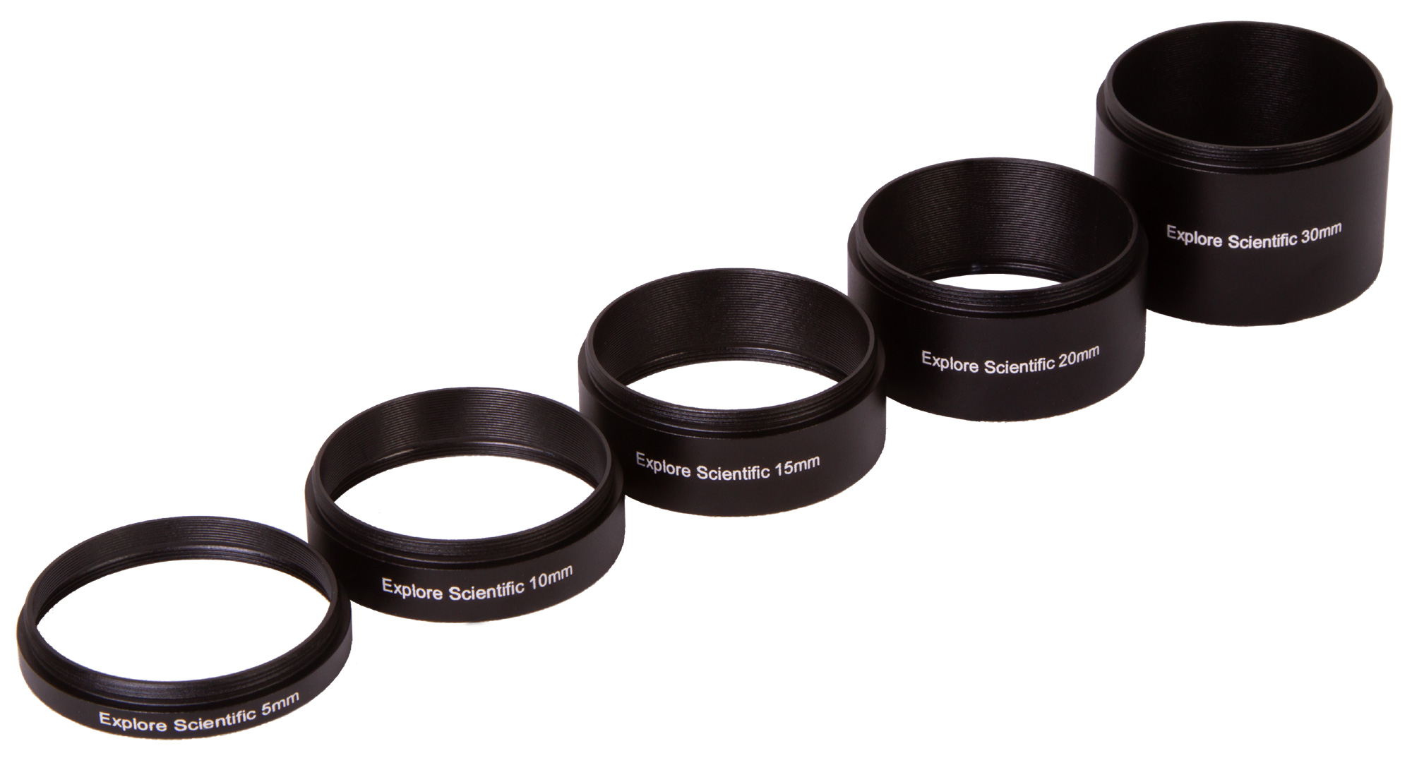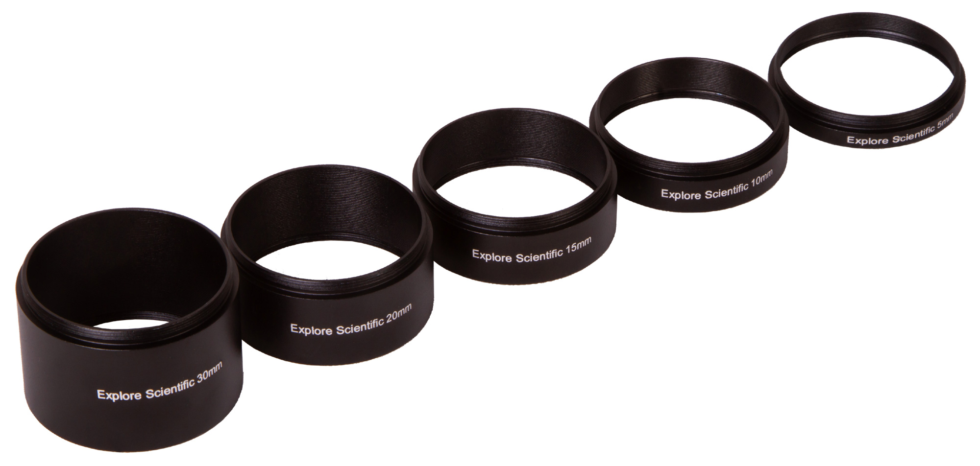 Набор удлинительных колец Explore Scientific – это пять колец (30, 20, 15, 10 и 5 мм) для изменения фокусного расстояния. Кольца широко применяются в астрофотографии, позволяя изменять поле зрения без ухудшения качества картинки.