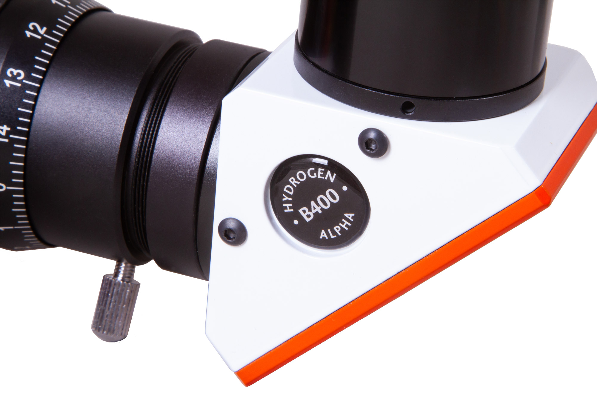 Оптическая система телескопа состоит из несъемного эталона Фабри-Перо и блокирующего фильтра B400, встроенного в диагональное зеркало. Они работают в паре, и только так обеспечивают защиту от вредных излучений и позволяют наблюдать процессы, протекающие на солнечном диске. Уровень фильтрации составляет менее 0,75 ангстрема. Ни в коем случае не используйте телескоп без блокирующего фильтра.