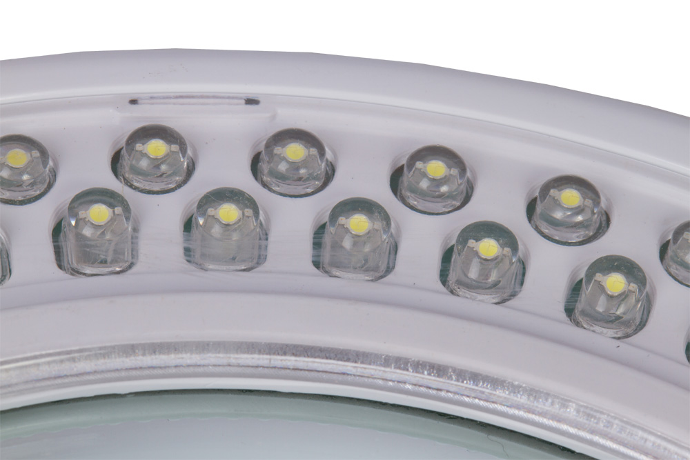 Лупа имеет встроенную подсветку – 90 ярких светодиодов расположены по периметру линзы и ярко освещают область под ней. Вы сможете приступить к любимыми занятиям в любое время суток. Для питания подсветки используется сетевой адаптер, батарейки не требуются. Для защиты от пыли и случайных повреждений лупу можно закрыть откидной крышкой. Она расположена прямо над линзой.