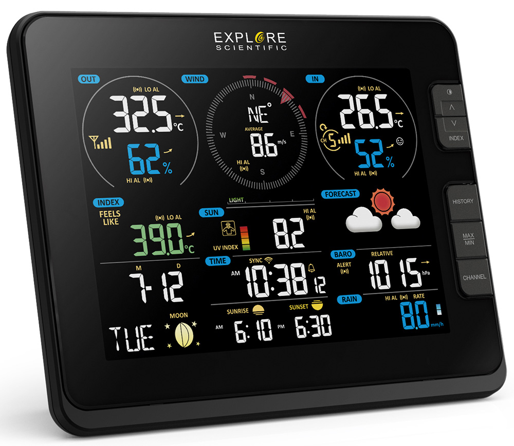 Метеостанция Explore Scientific «7 в 1» Wi-Fi умеет проводить множество измерений внутри и снаружи помещения, взаимодействовать с популярными погодными приложениями, составлять прогноз погоды на ближайшее время и строить графики изменений показаний. Также она измеряет УФ-индекс и уровень солнечной радиации, показывает время, дату и день недели и может поднять на работу громким сигналом будильника. Это многофункциональный прибор, который позволит вам быть в курсе любых изменений погоды на улице и микроклимата в доме.