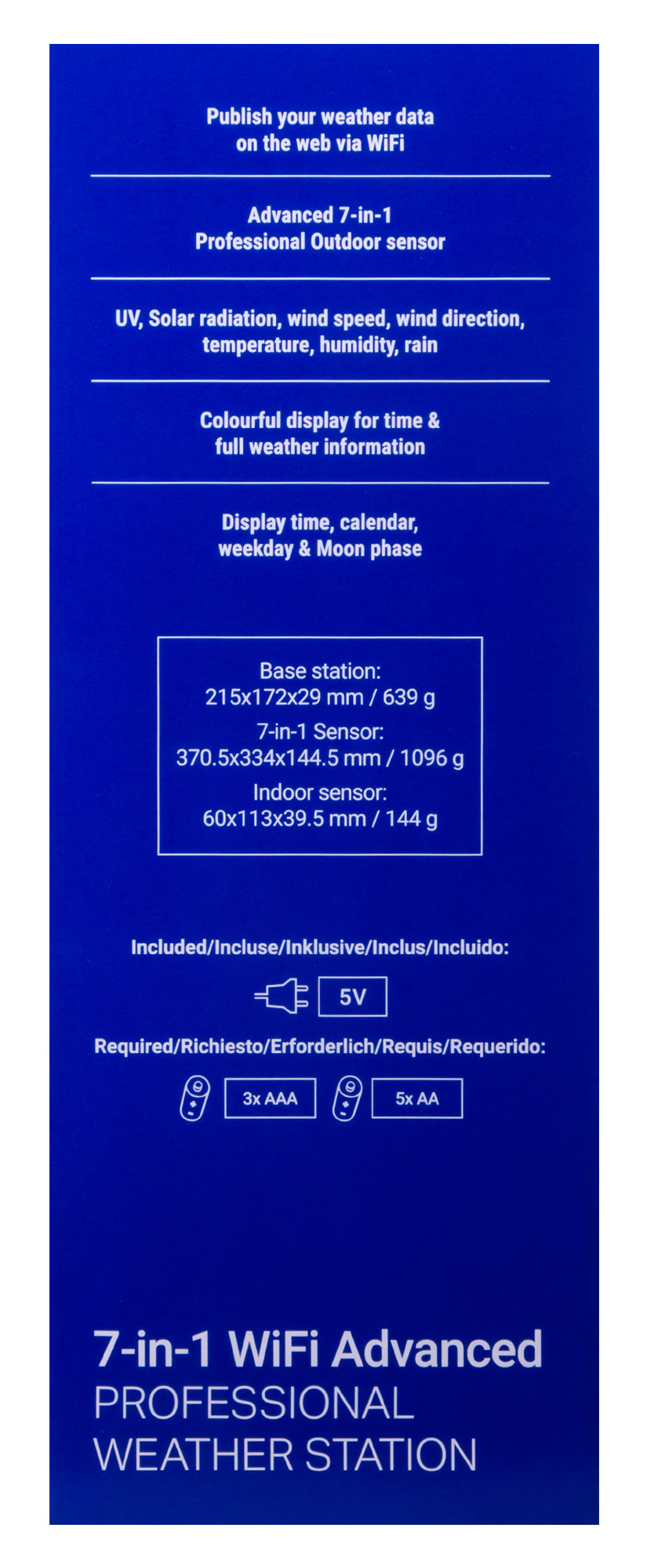 метеостанция: сетевой адаптер 5 В, 1 А (в комплекте) и батарейка типа ААА – 3 шт. (нет в комплекте) мультидатчик «7 в 1»: батарейки типа АА – 3 шт. (нет в комплекте) наружный датчик: батарейки типа АА – 2 шт. (нет в комплекте)