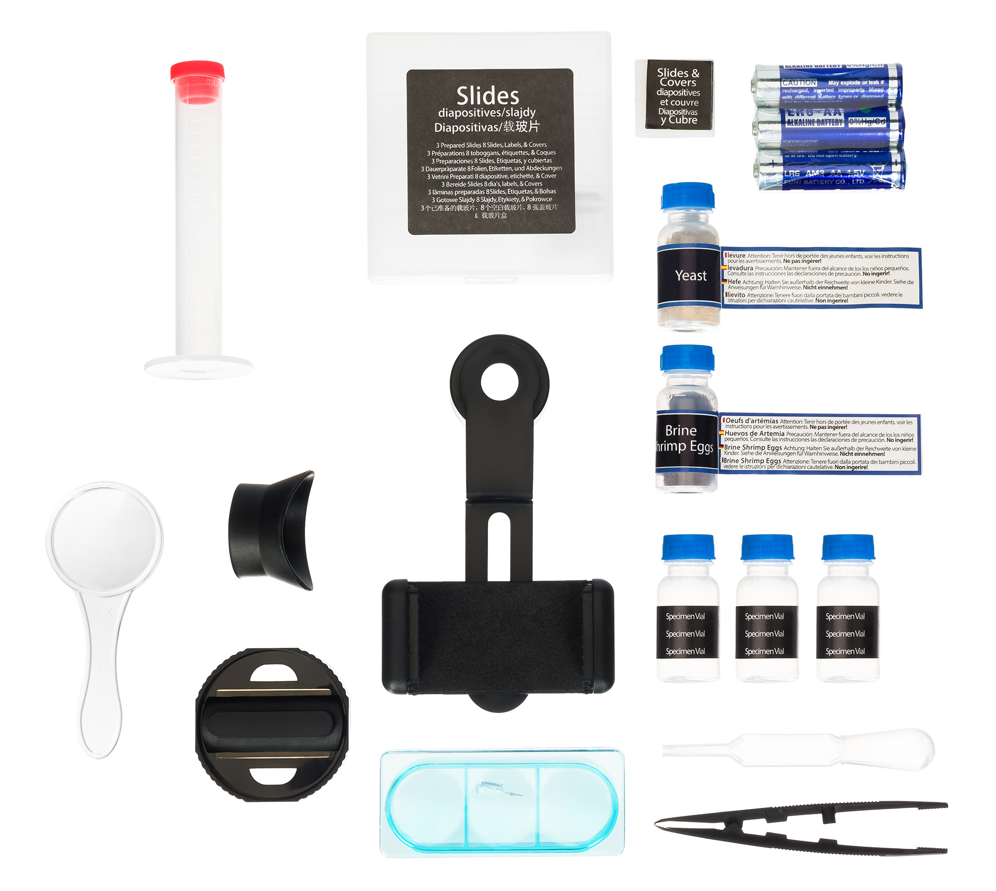 В комплект поставки включен набор для проведения опытов. В него входят готовые микропрепараты, инструменты для создания собственных образцов, чистые предметные и покровные стекла, флаконы с образцами и инкубатор для артемии. Сразу после вскрытия коробки юный ученый сможет приступить к исследованиям и даже вырастить в небольшой колбочке живого морского рачка.