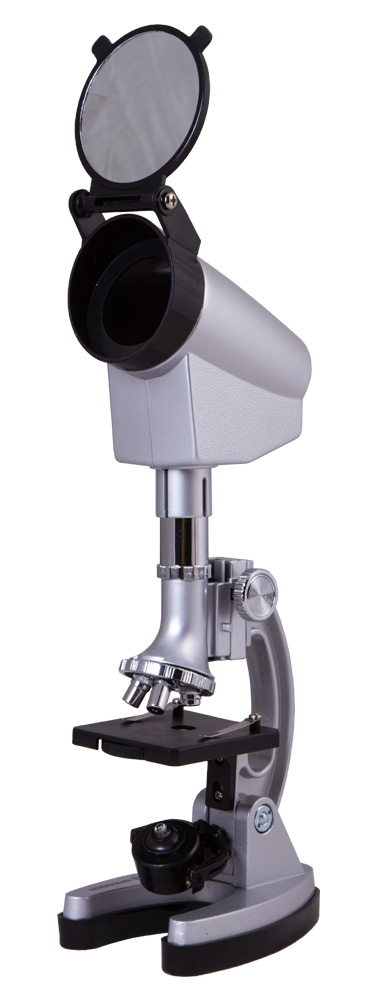 Для освещения образцов можно использовать или зеркало, или галогенную лампу. Оба источника освещения расположены на вращающемся диске в нижней части микроскопа. Лампа работает от батареек (нет в комплекте), что позволяет брать микроскоп с собой в гости или на природу. Зеркало отлично подойдет для наблюдений в дневное время или при наличии внешней лампы, а встроенный осветитель можно использовать в условиях плохой освещенности.